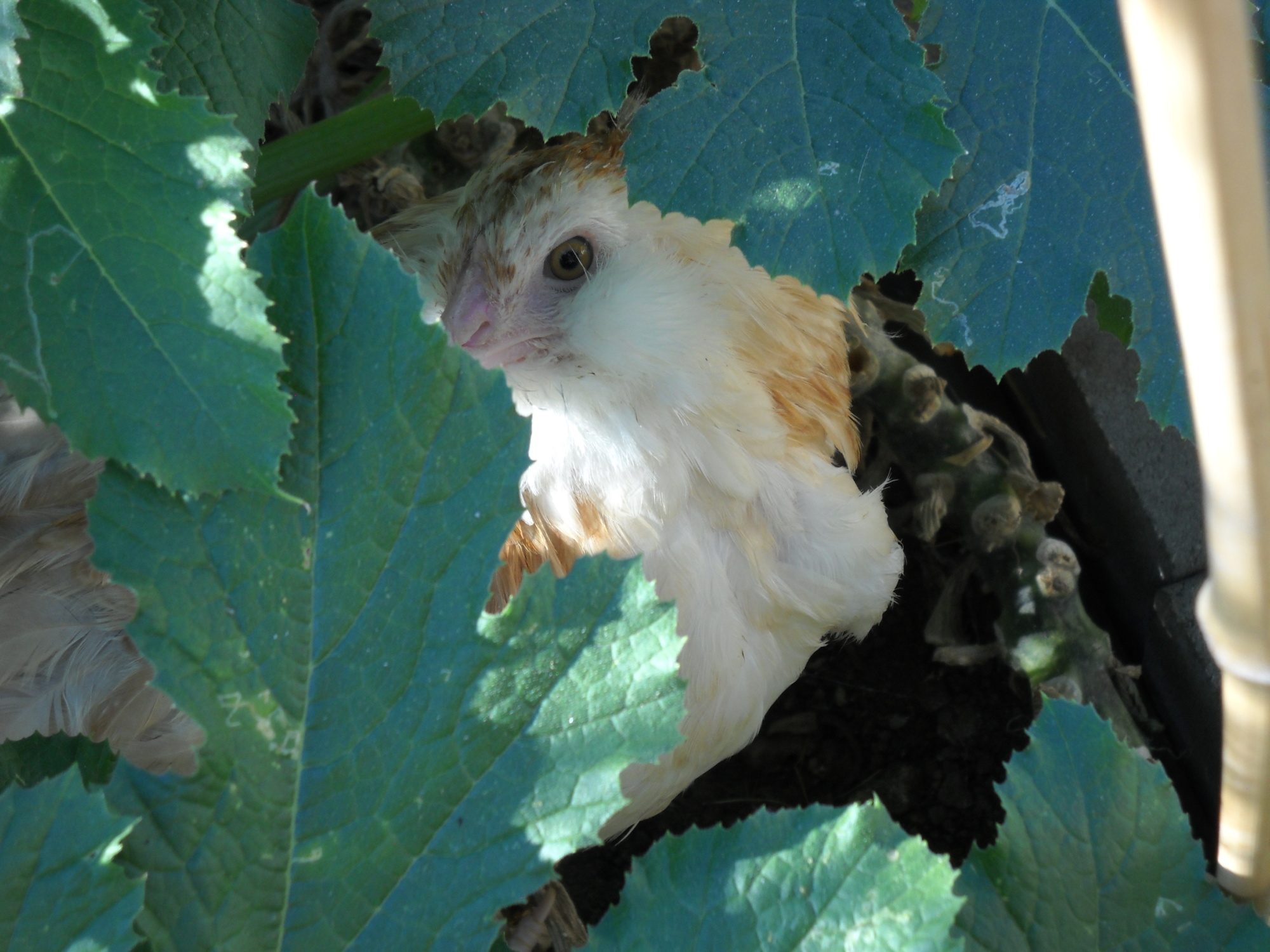 "Mini" escaping the house still wearing her chicken diaper