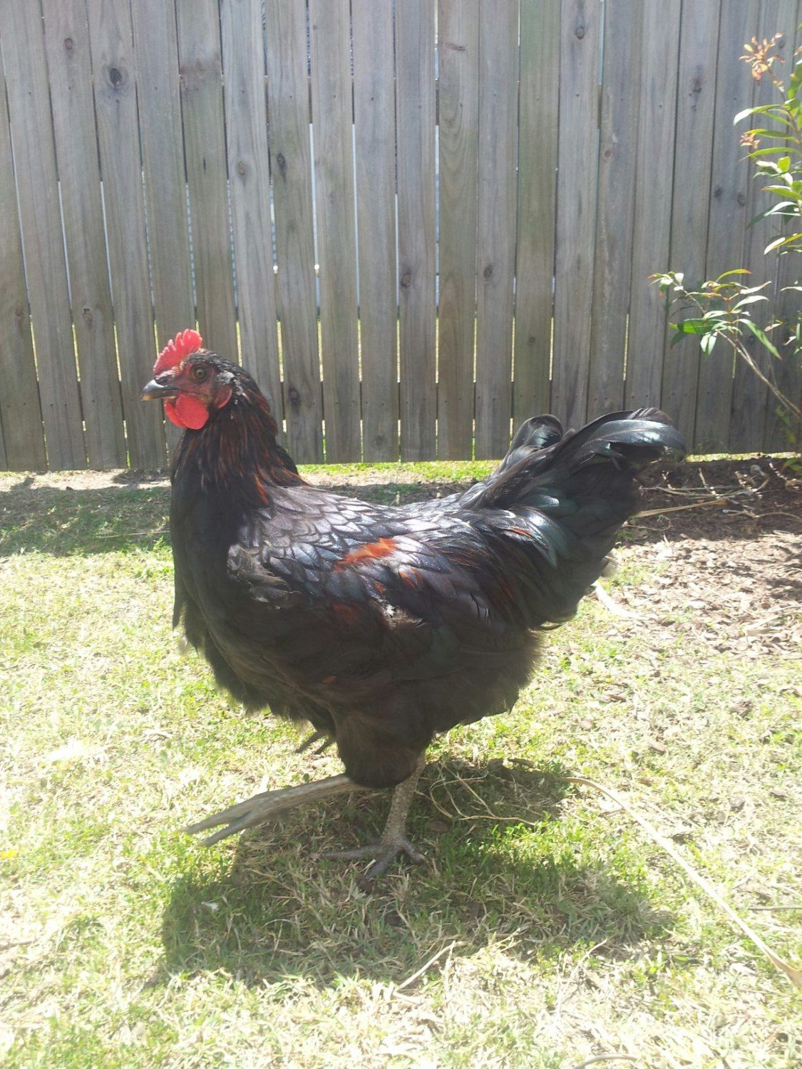 That is one cool looking chicken!!His saddle and tail feathers are much more pointed and 'flowy' than Guinness' are. Legs are much thicker. He also looks younger than she is, which would explain the similar looking wattles and comb. Those reddish patches on his body and wings is also a very roosterish trait.