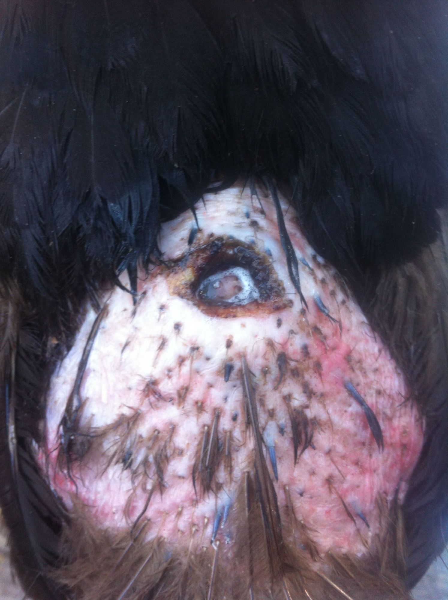 This today getting better i trim scab so feather grow. They push it up and she pick. She is so good she knows i clean her every morning and waits well while i cut and spray and clean. I have named her Holey Mary. I think she will live thanks so much!! She has good life now.