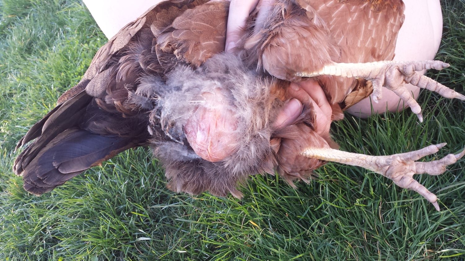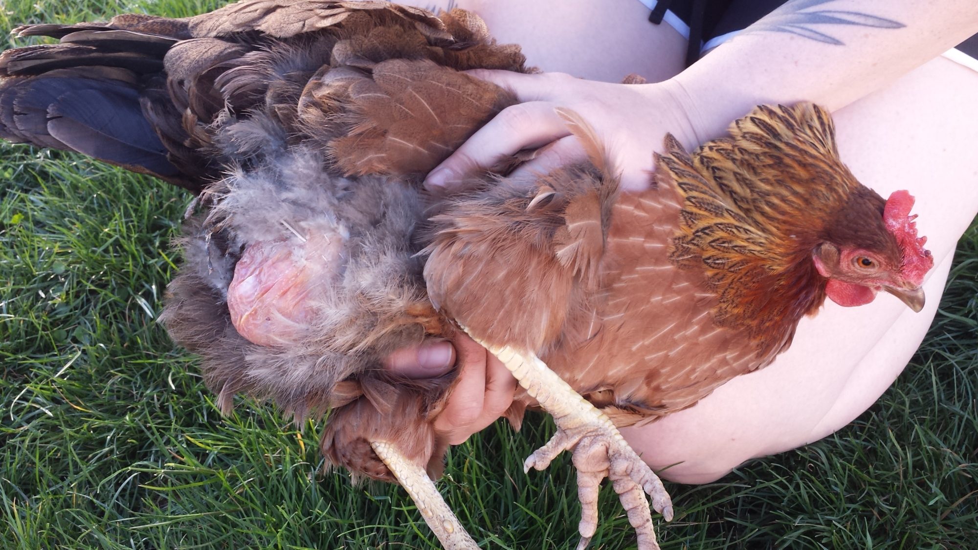 It almost looks egg shaped and sized, but it is very soft when I press on it. There are no feathers left on it and it's big, so I think she must have had it for a while and I feel awful about that! The featherless skin is pink with areas of red and some white spots on it.