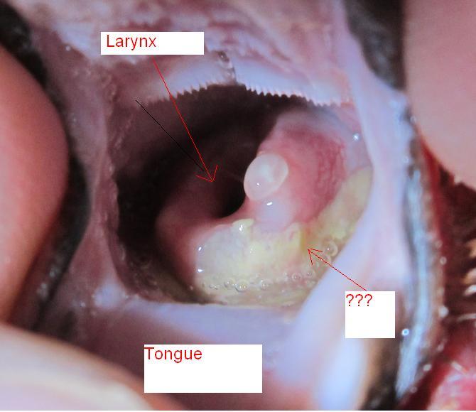 1 week ago I discovered that the yellow product came loose with a q-tip (roughly pieces). Now, the larynx is very swollen and the yellow product returned. She cannot any more eaten.