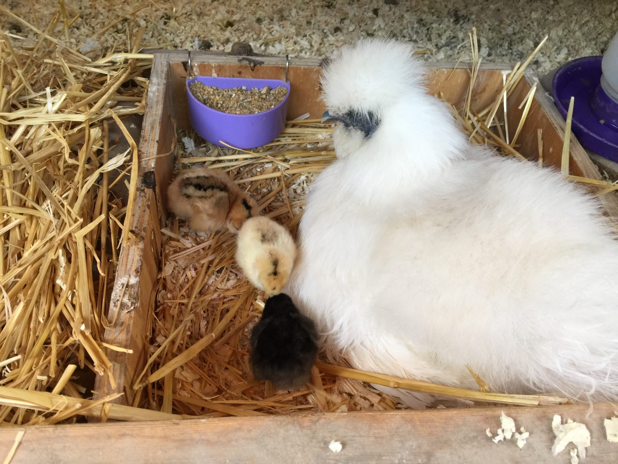 Here is a picture of what I do after the first day. You can see a purple bowl for a parakeet or bird cage hanging with chick start in it and then a chick water tower elevated on a brick on the upper right corner. I sprinked the chick start in the hay also. The hen is still not getting up and the chicks are 2 or 3 days old here but everyone can eat and drink. You can see the chicks finding the chick start in the hay. Hope this helps. I make sure the water doesn't get the hay wet. I build up hay around the edges of the nest box so the chicks can get in and out. I've had a chick stuck outside the nest box before because it fell out and couldn't get back in. With the hay built up like this the chicks can get in and out with the hen. She'll leave the nest at some point but go back in - the chicks can follow her this way.