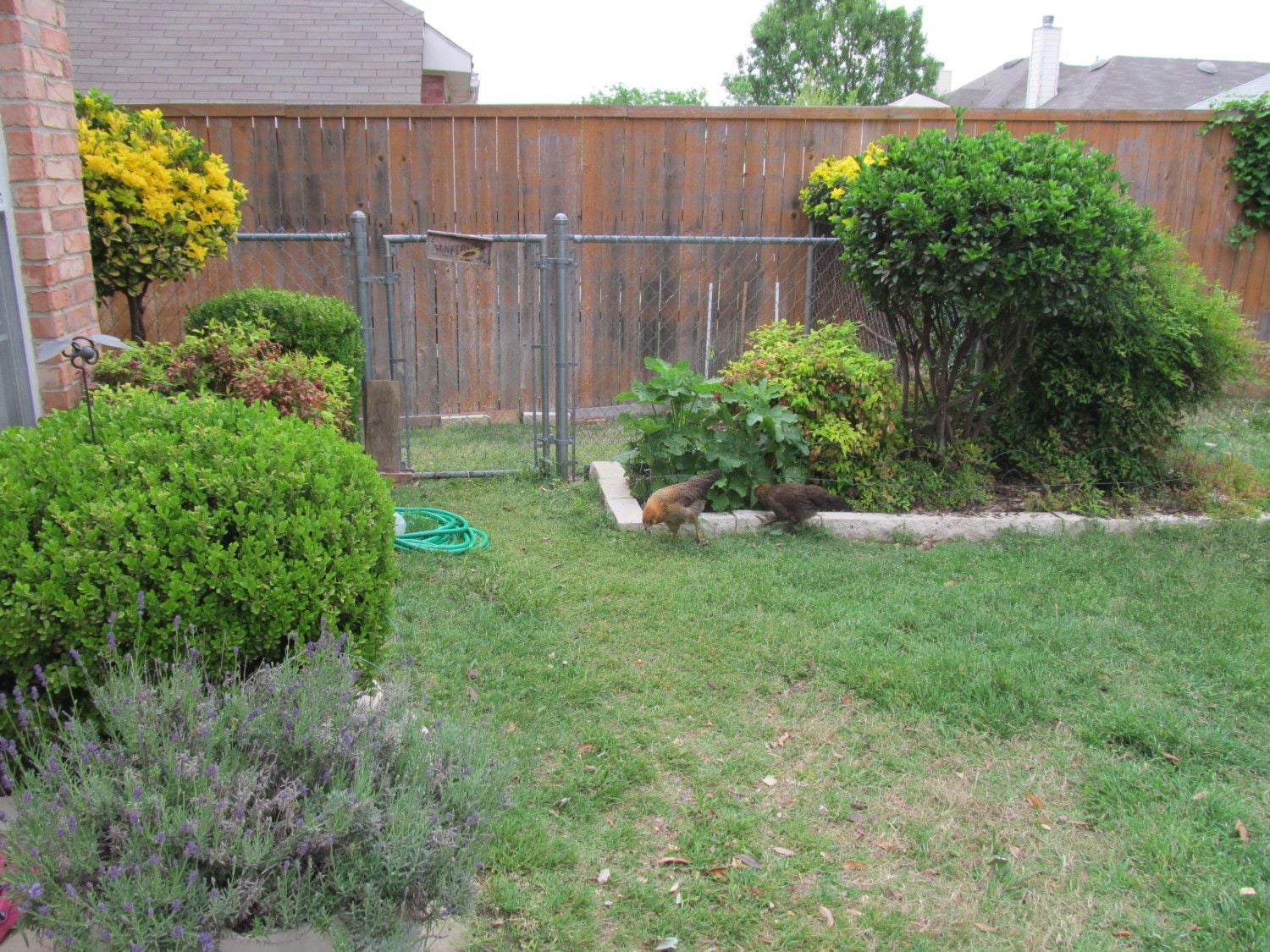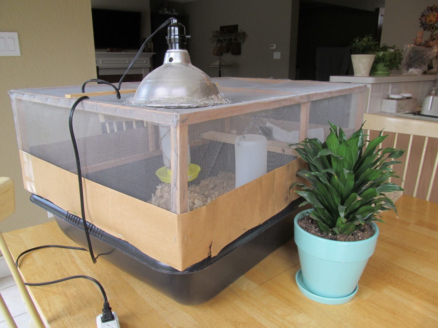 Secondly, they are becoming too large and quite frankly, smelly, to keep inside at night. I have a huge cement mixing tub with a tall screened lid for them to stay in at night...on my kitchen table. Hubby is tired of it sitting there and a little tired of the lovely aroma when he comes down to leave for work. They stay in an enclosed area during the day. Its a chain link fenced in area we had for our dogs. They love it out there.