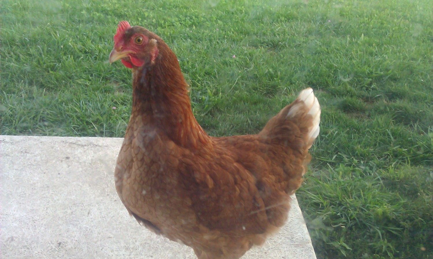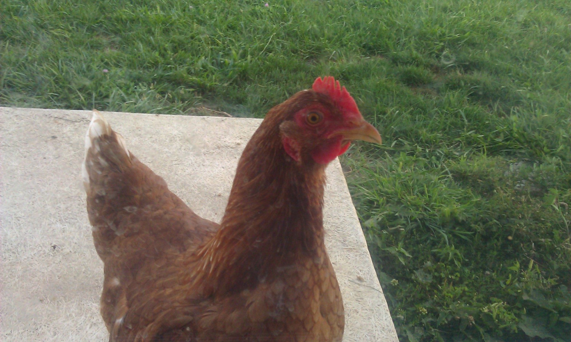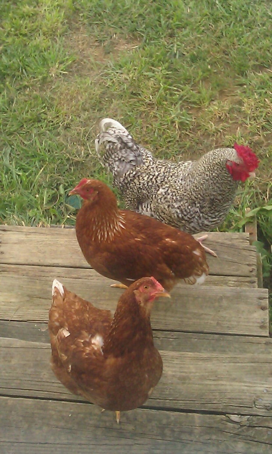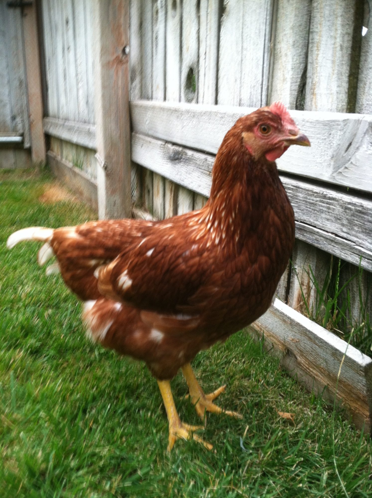 The closest chicken is one with a smaller comb, and seems to be much friendlier.