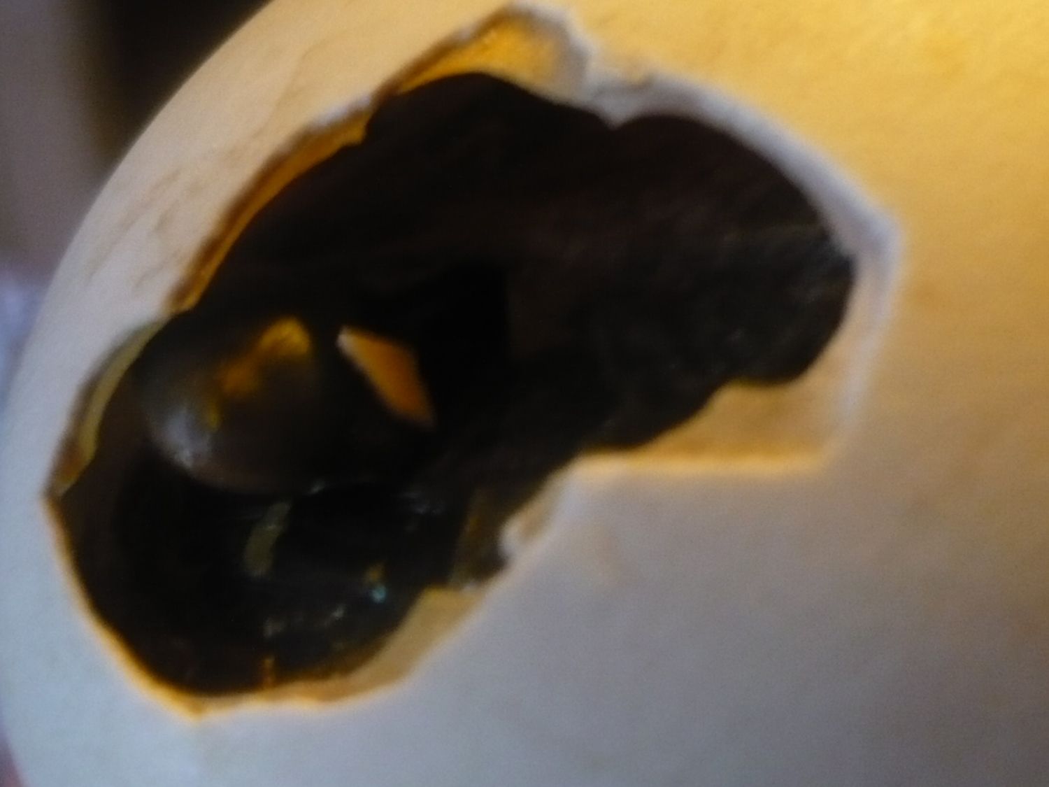 Dampened it so I could go outside and work without worrying. Notice the egg shell stuck to the bill, it's been enlarging the hole.