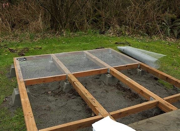 This is day 2 on March 27th. All the blocks, frame and stringers in place, screwed together and set to 8 x 12. Now I'm sure this is overkill but it was my decision to lay 1/2" hardware cloth before setting the flooring. I've had so many people warn me about rats and mice going to great effort to get into the coop. Sort of that "build it and they will come" thing. We do have mice and voles but I haven't yet seen rats around here but they obviously are around so I thought this would discourage them from trying to chew their way in from the bottom. I know a determined rat can chew through hardware cloth but I'm hoping this will influence them to find another way. I will most likely staple hardware cloth around the bottom of the whole thing as another deterrent.