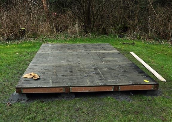 And here is the finished platform late on the second day (just as it started to rain again! Geesh!). Floor is 3/4" marine grade plywood (or is it called OSB?) and countersunk with screws. Took a lot of time and effort getting 16 pier blocks and all the posts level and square!! A lot of time digging and moving blocks and boards around. I'm so glad this part is done! We both had backaches the next day.