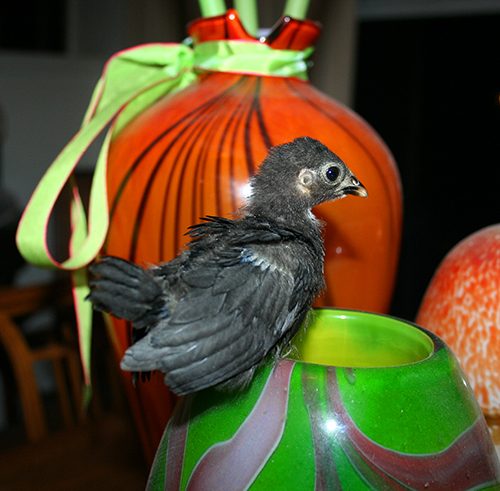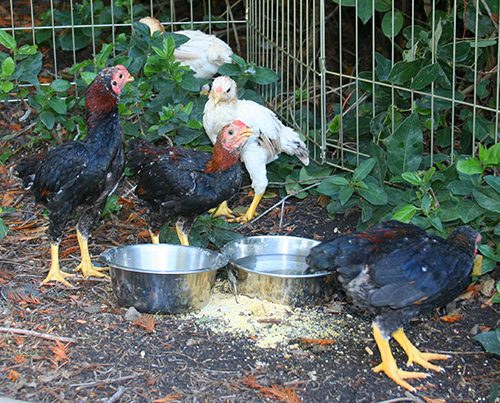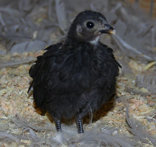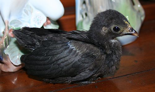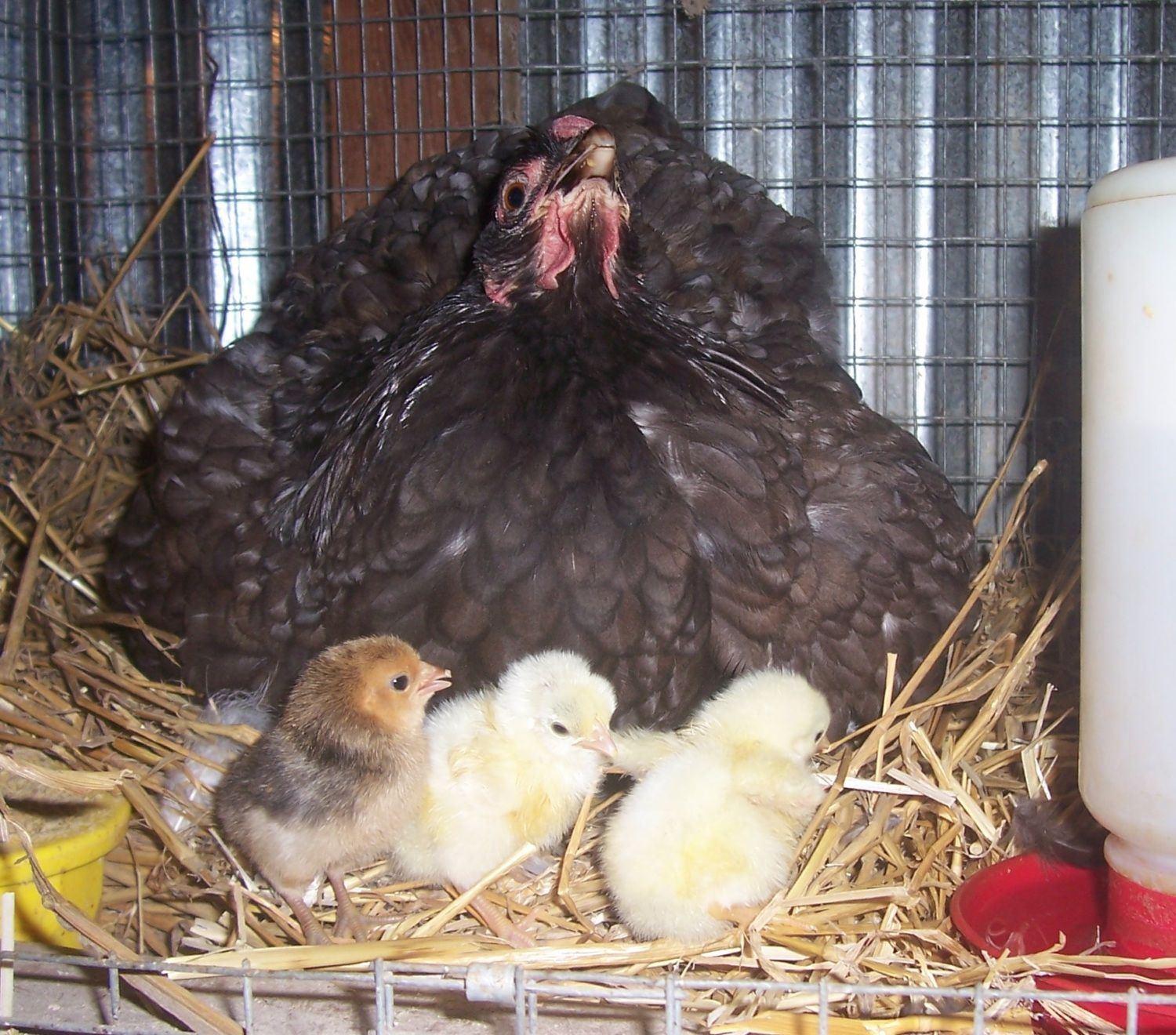 Bantam Delawares being raised by a Large Fowl Wyandotte. These little chicks were first incubated under the hen in a nest box and then three days before hatch, the eggs were placed in an incubator and allowed to hatch. When one day old and able to eat and drink, they were placed back under their broody hen to bond in a wall cage. At one week, the family was moved to a floor pen.