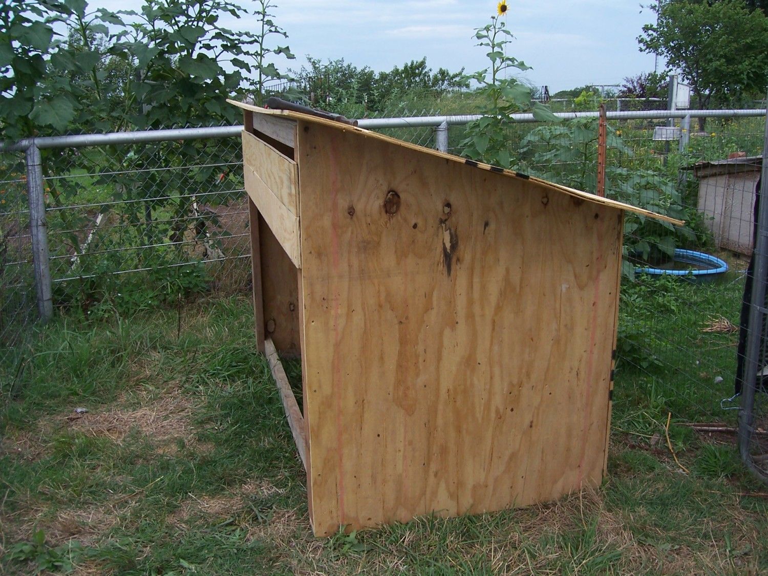 Here is the smaller one (3.5 x 6.5 feet) that was put in this summer for the youngest hatch. The open front faces south. The roof is now covered with shingle sheeting and it is painted white. For winter I have a sheet of rubber matting that is 1/8 inch thick hanging from the front from three nails leaving 12 inches open on each end.