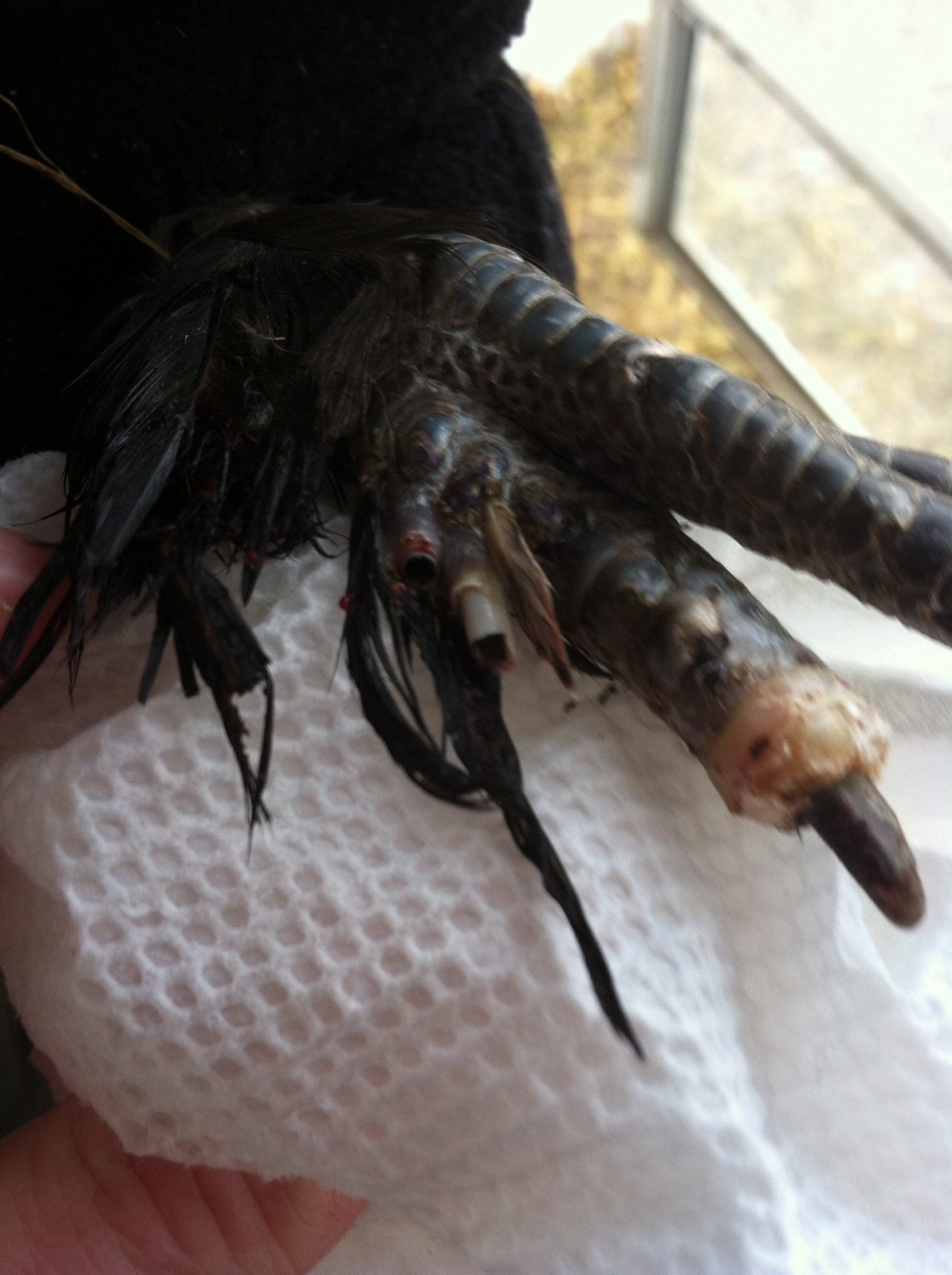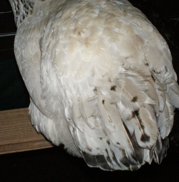 You can see here where they broke off at the pin part of the feather. I pulled out those broken pins plus some around it. As you can see she has frost bite on her toe. She liked to stand in her fermented feed. Hence the frost bite. That problem has been fixed