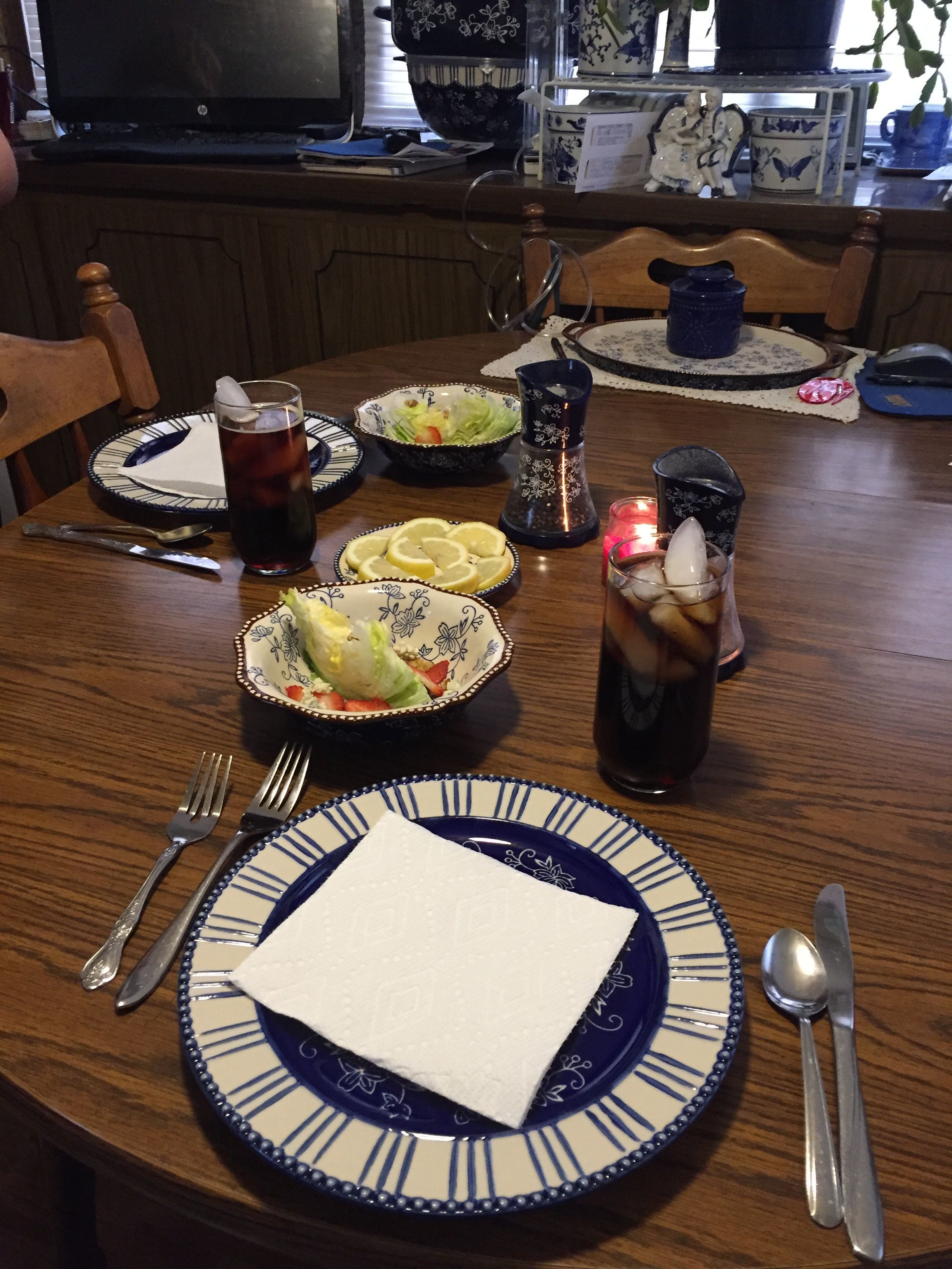 Last night was a Cobb salad. It was kind of interesting, we had the power go out just after I got home from the grocery store. Thankfully the stove is gas, so I could still cook the bacon and boil the eggs. I just bought a roast chicken from WinCo. It all came together pretty well, considering it was done by headlamp. I'd wanted to bake French fries, but couldn't. So, we toasted bagels on the burners and slathered with cream cheese.