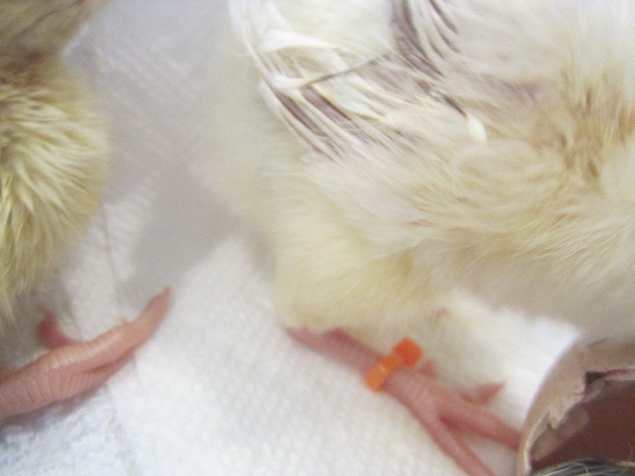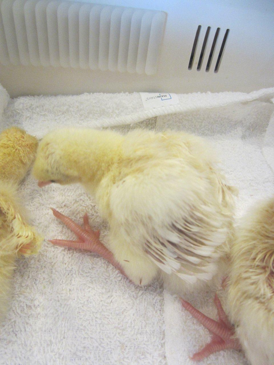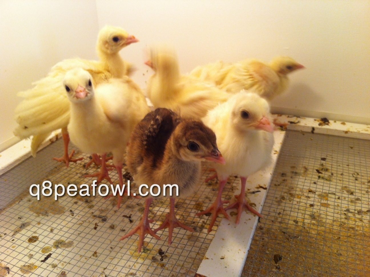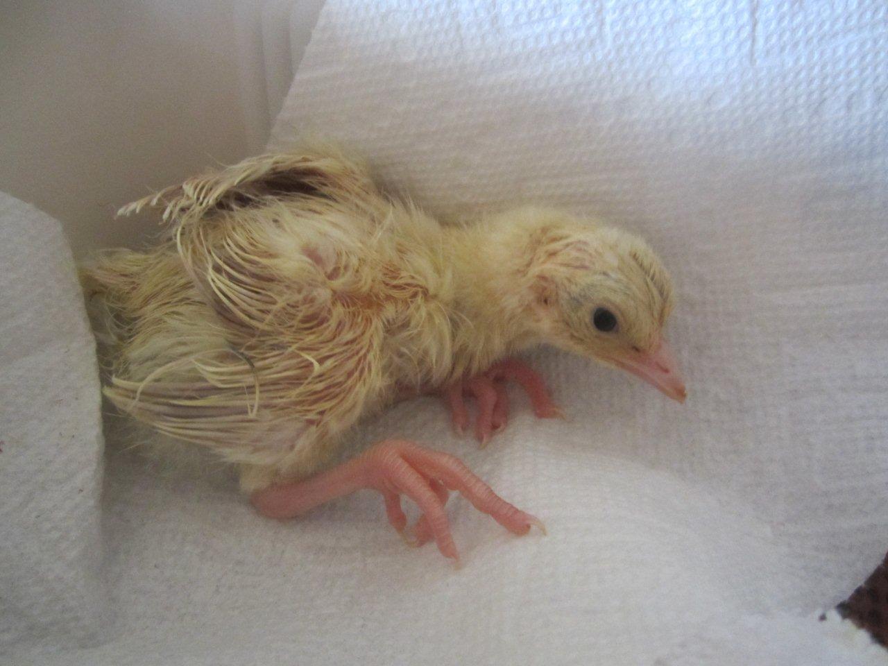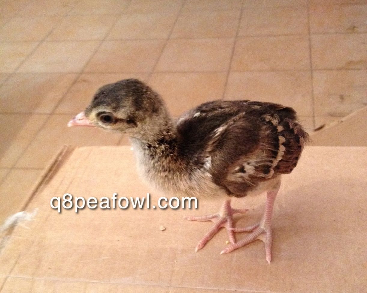 Few days old chick, they start almost white then they start to get their dark feathers after 2 weeks, i will post some updated pictures for them later.
