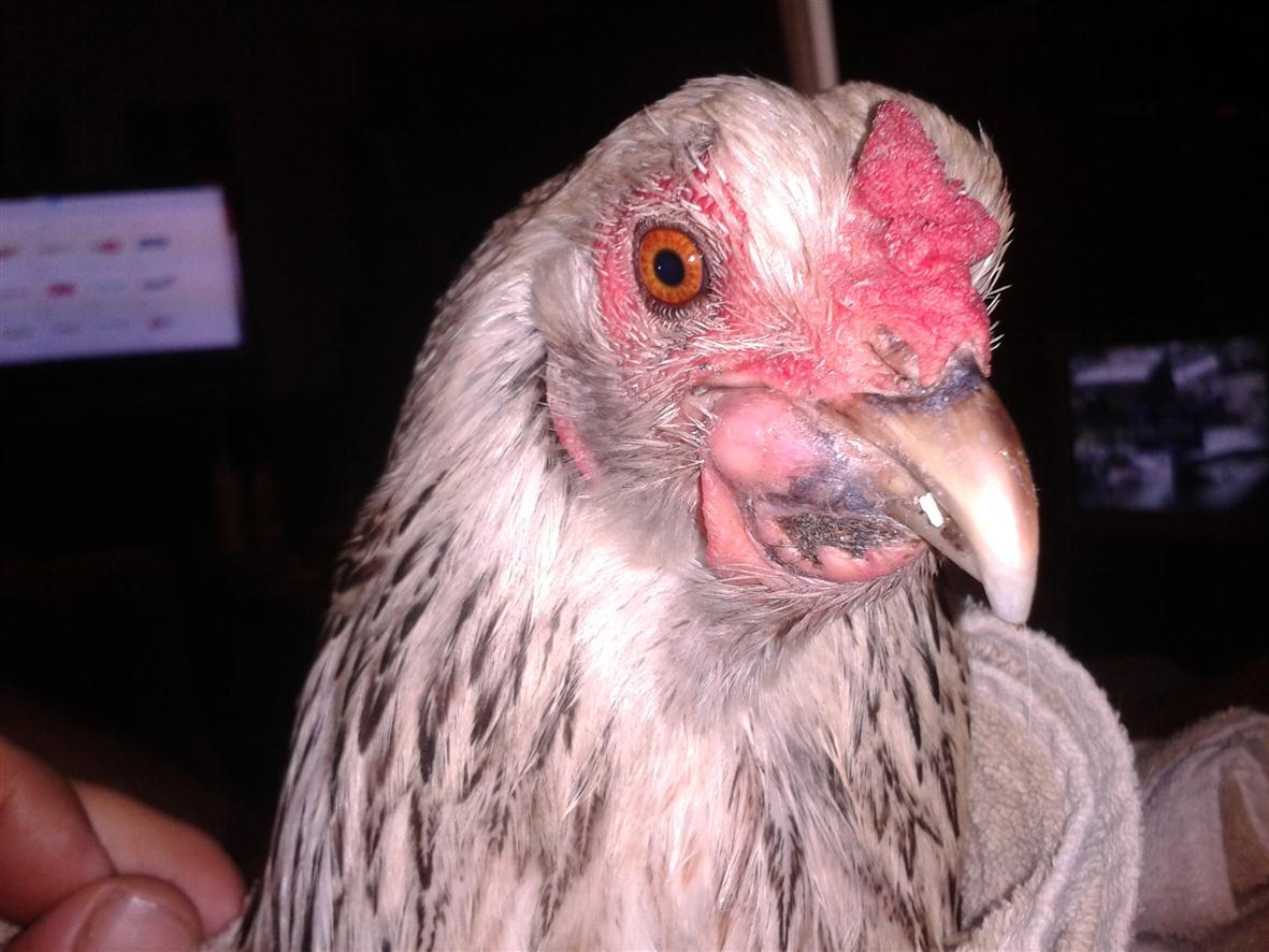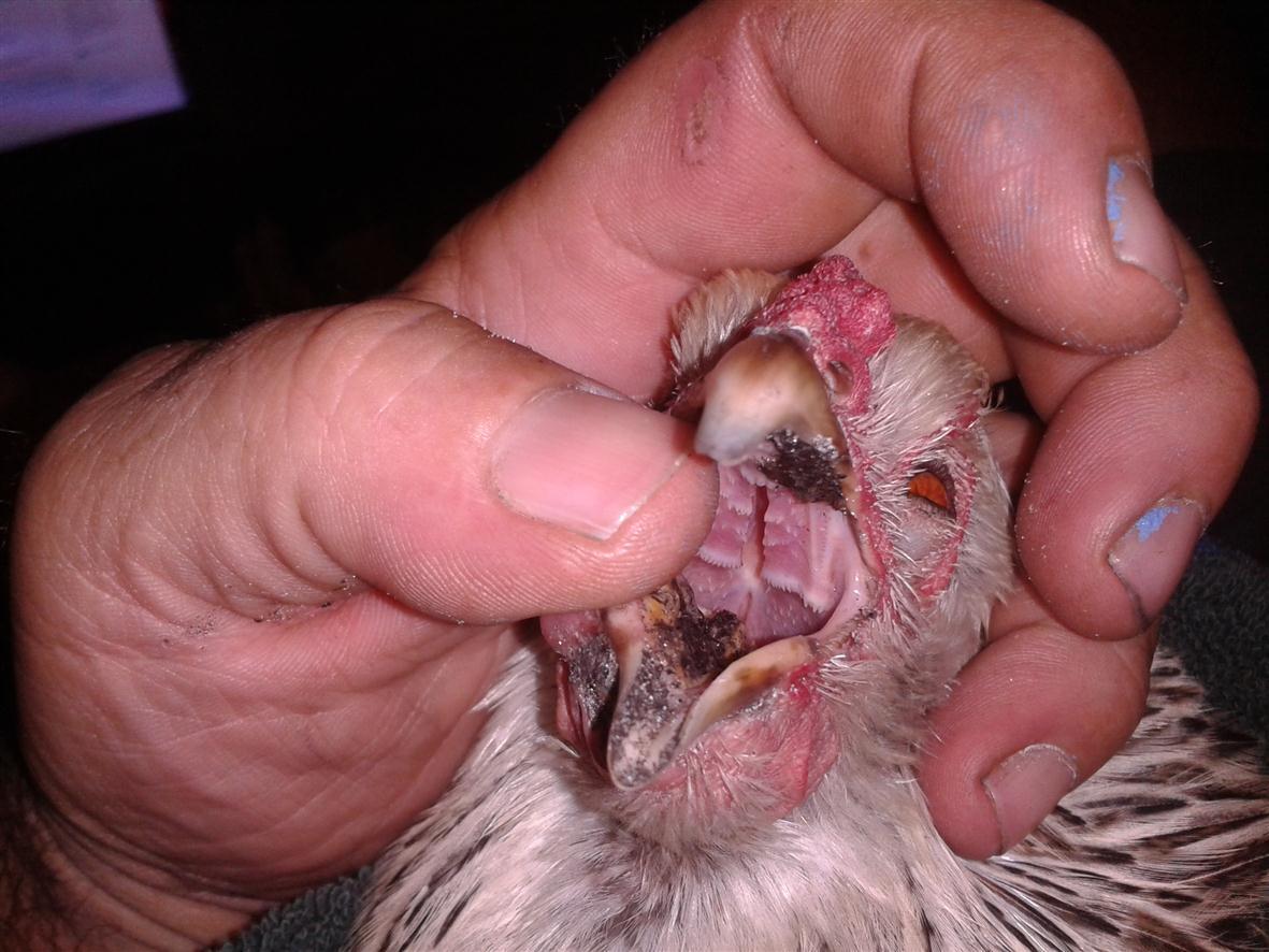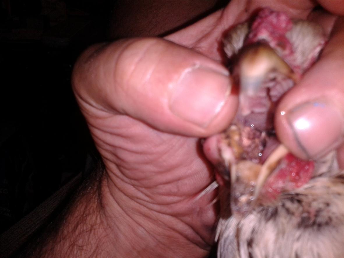 Hi Kathy and thanks. it's got to be canker as it matches up with the dozen or so pics i have seen thus far. i am just wondering about the external face and jaw redness and swelling. i found some mupirocin 2% ointment that works great on skin infections and abcesses, so i thought i'd try that, rubbing it over her jaw and face. Hopefully she looks even a bit better tomorro. Since i have no baytril, i am trying to use what i have onhand. Because tylan 50 didn't touch it, i'm thinking it's a different type of bacterial infection so i am trying to use the broadest spectrum antibiotic i can that i currently have. Since Doxycycline is actually used in birds, i figured it was the safest bet. i also have cypro, an even stronger one, but i found very little about it's use in animals, especially birds. other choices are clindamycin and cyphlexin. i finally have her confined with electrolyte water, layer/scratch mix, and a raw egg in a bowl. later on i will lightly scramble it over heat but i have so much else to do atm. at least now i am sure about the canker part. just waiting for the drugs to kick in and the swelling to go down. will have a buddy over tonight to help me get more gunk out of her mouth and throat. As for wet pox, it really doesn't look like it in my opinion.