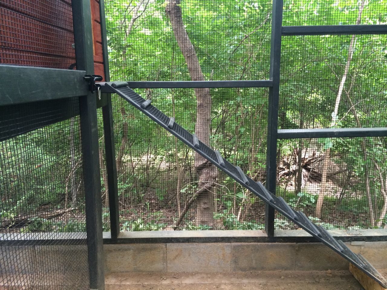 My only concern is that a chicken might get a toe stuck under the HW cloth while coming down the ramp. Is the cloth secured enough to keep chicken toes from slipping under when coming down? I know on my ramp, which is kind of steep like yours, I see the girls kind of skidding down from cleat to cleat. As long as there is no slipping on the HW cloth I guess they should be ok but I would still worry.