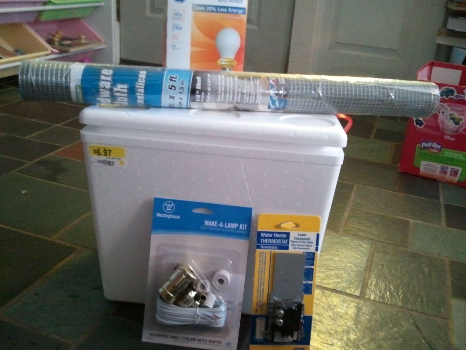I have a piece of glass I took from my mother-in-laws how yesterday that she was going to throw away and it'll work perfect in the top of the cooler...I had a choice in coolers so I went with the more expensive one, seems more sturdy, it was $7 at Walmart. I need to get a couple more bulb thermometers but geeze, the smaller ones are hard ti find...I don't want a huge one!