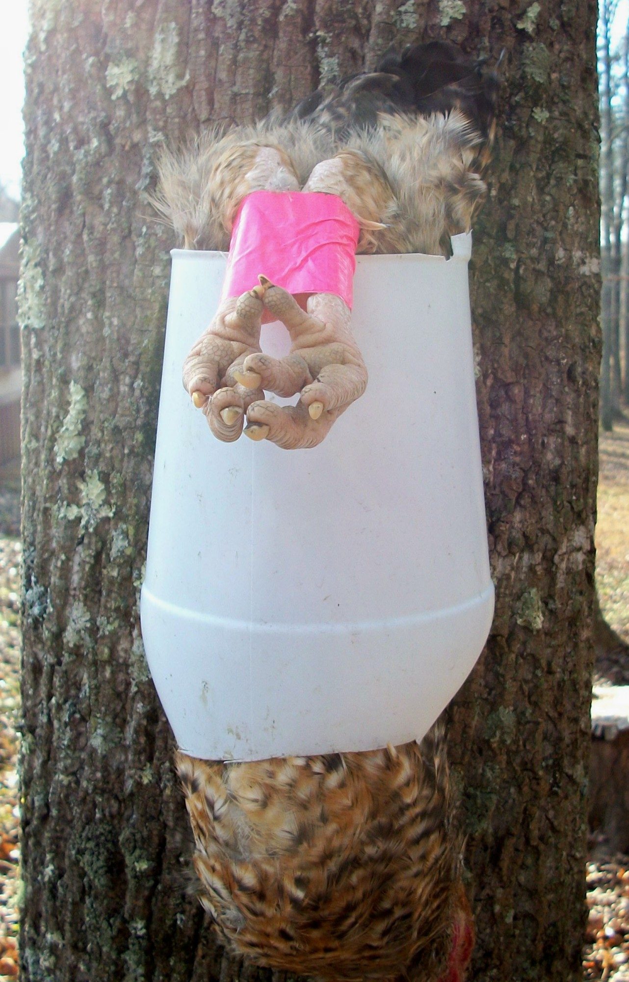 You'll have better success if that cone is very secure to the tree...no mishaps that way. The chickens are heavier than they seem, especially when they are moving about during the dying.
