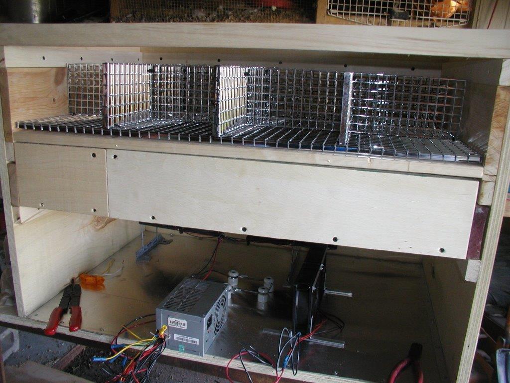 This picture shows both the top compartmentized tray and the lower egg tray installed as they will be when I'm using it. There will be another board over the fronts of both these trays so they pull out like a cabinet drawer. I should have taken carpentry in school instead of shop and welding. Egg tray front was made with two pieces of plywood cause I couldn't find any 3"-4" boards so I had to use scraps,thus the extra drywall screws on the left side.