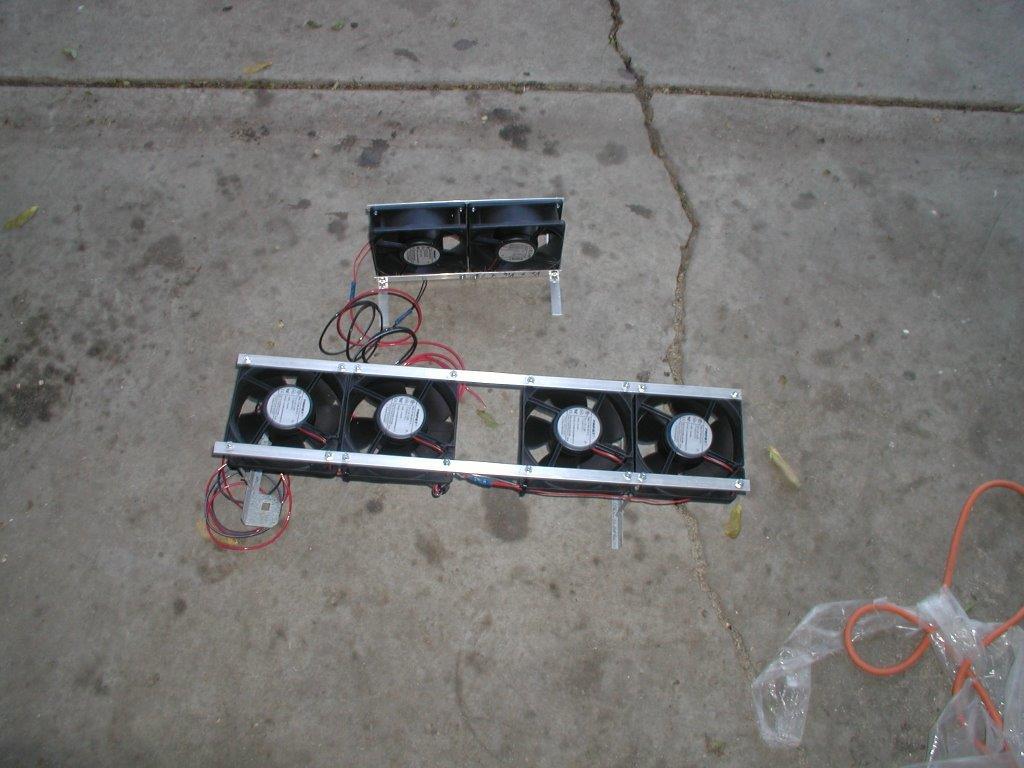 Next is the fans. I bought a few long pieces of aluminum to use for holding all the fans together. The group of 4 fans will be running in 12 volts,the two fans will be placed in front of the heating element and are going to be running on 5 volts. I mounted all 4 fans so they are blowing straight up towards the trays. The other two are blowing horizontal. This mounting and wiring these 6 fans together took me about 2 hours of time. But they all work and from the air that I feel blowing off the 4 fans it will be a wind tunnel inside once the cabinet is all closed up.