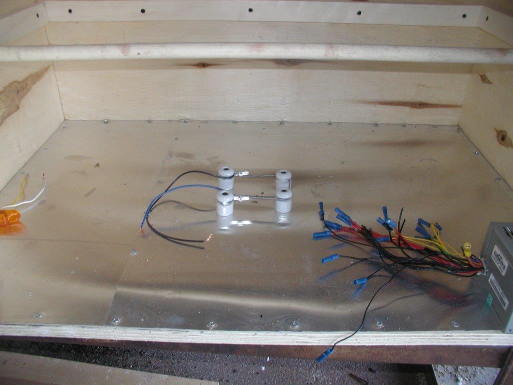 Next is the heating element which is 250 watts. If it's not enough I can easily add another heat source using a wafer thermostat to get temps in the mid nineties before shutting off and then this element won't have too much work to do by itself. This sized element is used on all sportsman incubators which are pretty close in size to mine,maybe a little smaller. You can also see a white PVC pipe across the width and about a foot up,This will be for mounting my heat-rh sensor on and my remote transmitter that send the temp and humidity readings to the digital desktop display so I can see whats going on inside this contraption without going out in the garage to look