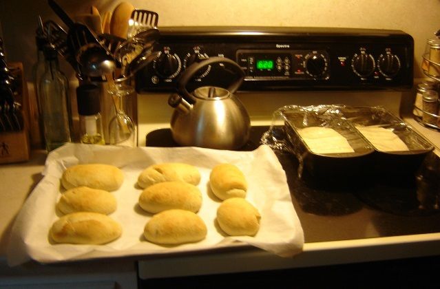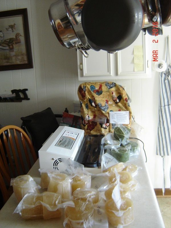 if you get bored feel free to come on over and make me and mine some quiches, we'd need 5 probably. We are big eaters. As for the going out to eat, not anymore. 7 people is too many to feed in a restaurant. Not to mention the health risk of eating out. There is also the factor of my family being spoiled with fresh homemade food daily.Why eat out when it's fairly easy to make good eats at home? Accck!! 2 days ago I had a crap up the kitchen day. Ever have one of those days when you open the fridge and get an overpowering urge to purge? The fridge, not the contents of yer stomach (Probably not cos yer saner than me). I spent the previous couple of days cleaning up broken branches from the ice storm last week and had neglected cooking. I looked in the fridge and noticed all the fresh veg and 2 whole chickens that needed something done with. So.. 8am cut up chicken, remove bones. 8:30am add onions, carrots, celery, carcasses, spices, water to stock pot. Cook stock, skim scum, skim scum, yadda yadda. 9:30am fry chicken fat and skins for the mutt. Mix up bread dough for dinner. 10:30am vacuum seal some chicken parts and put in freezer. 11:10am dice up chicken not frozen for chicken/rice soup tomorrow. 11:30am divide risen dough put into pans. 11:45am. prepare asparagus, leek, gruyere quiches. 12:10pm put quiches into oven. 12:45pm put bread into oven. 1:00pm take quiches out of oven. 1:20pm take bread out of oven. 1:25pm eat pastrami sandwich for lunch. 2:00pm cut up 2lbs. broccoli, dice an onion, peel & dice 2 cloves garlic, dice leek greens (the dark green bits that most people throw away). Add 2Tbs butter to dutch oven, toss in previously cut up veg and cook to death for 20 min, add in water, chicken stock & 1/2lb spinach and cook for 3 mins. add shredded parmesan & cheddar cheese and puree with blender, let cool then put in freezer containers to freeze overnight to be unmolded and vacuum sealed tomorrow. 3pm put quiches in fridge. 7pm eat some quiche with fresh bread. 8pm strain stock, cover and put outside overnight to cool. 8:30 p.m. Look at kitchen.... Arrrgh!...Arrrgh! again.. then let the cleaning begin. Yesterday:![]()