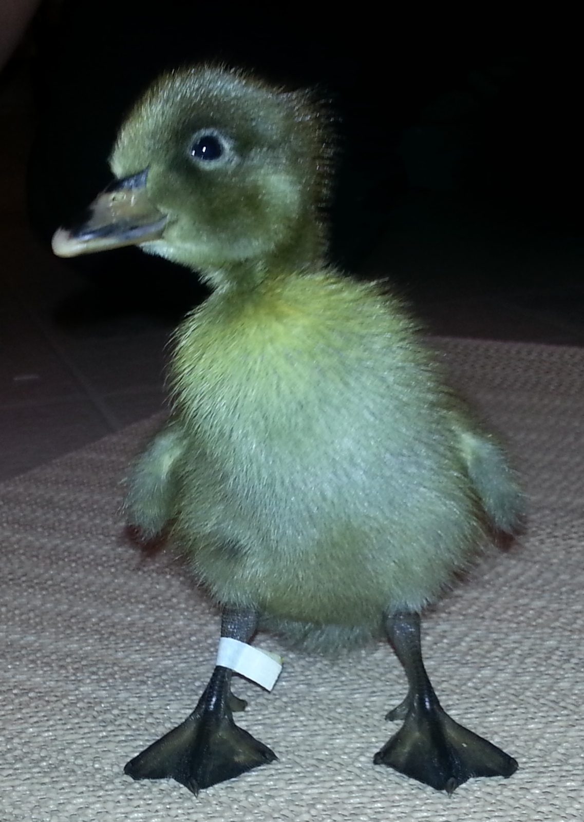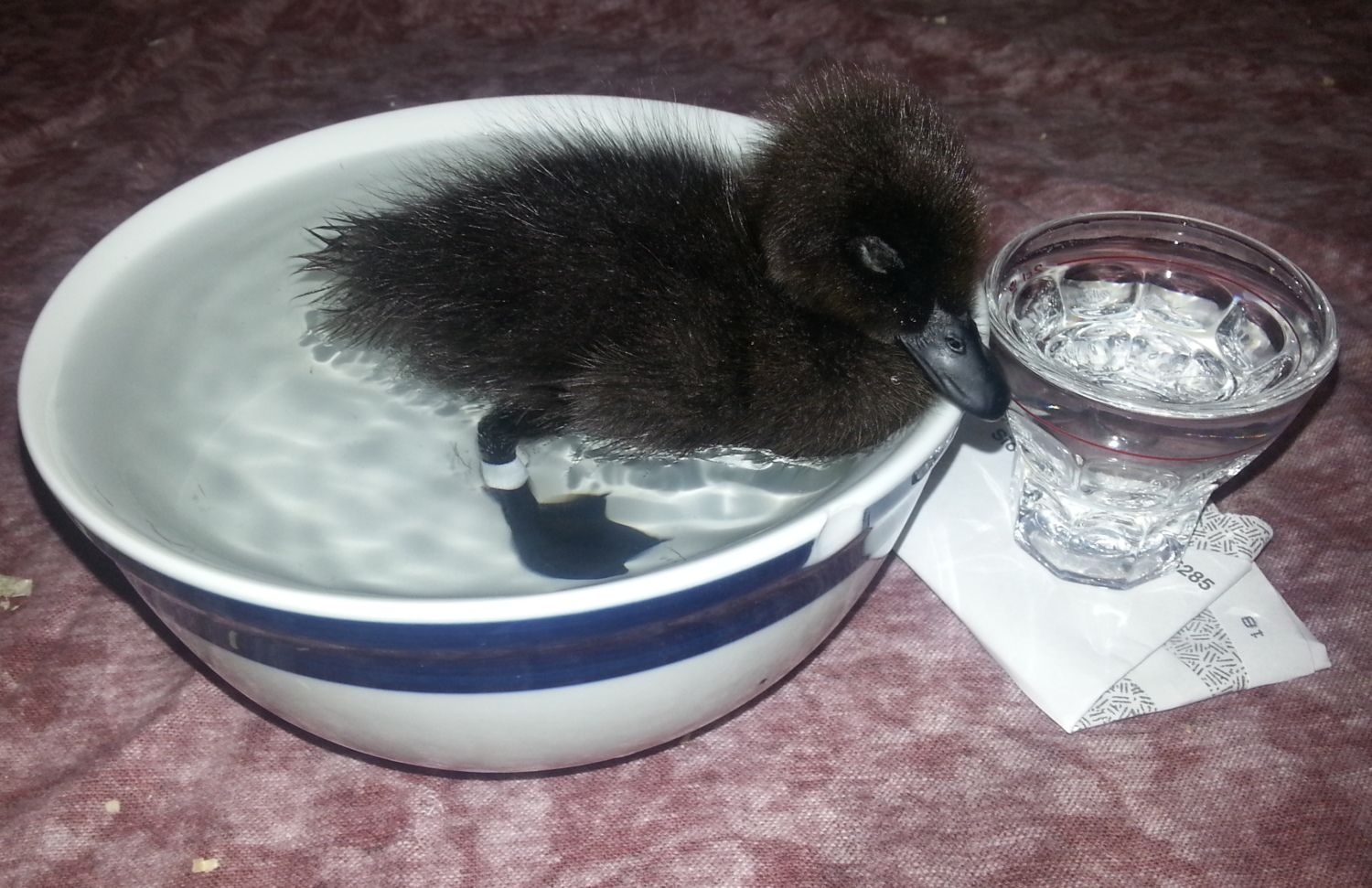 This is Ebony. She is a Black Runner. She is our hard luck story. When we first got her, she was constipated and wouldn't eat or drink. She probably owes her life to BYC so thank you. We cleaned her up with a Q-tip and some water and isolated her with her own water and food very close to her. She nibbled and sipped a bit, but not enough to keep up her energy let alone grow. One or two crumbs of food an hour and an occasional bill dunk in the water. She seemed to have given up and just wanted to sleep. At this point, I weighed her and the other runners for a comparison. She weighed 1-3/8oz. and the other runners weighed around 1-7/8oz. Then I read conflicting info about sugar in water, so I decided to split the info down the middle. I put a pinch of sugar in the ring of her waterer and mixed it with my finger. That way it didn't affect her whole water supply, but gave her a pretty good kick for a short time. She took her normal bill dunk in the sugar water, then did it again maybe a minute later. In five minutes, she was drinking water like a champ, it 10 minutes she was eating like she was starving. She even got to where she was walking like she had some energy. We put her back in with the other ducklings and she was immediately overpowered so much that she seemed to give up again. We split the brooder down the middle and put her and the other three runners in one half, and the rest in the other half. She was still constipated though and so we kept cleaning her up every couple hours. This caused her some obvious discomfort and was only marginally effective. After a day, her butt was getting kind of raw and we thought this was awful tough on her. She was flowing a little better, but still not anywhere near what the other ducks were putting out. So we thought we would try a very warm bath.