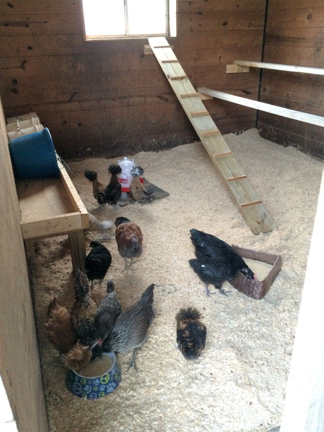 . The front bars have been enclosed with hardware cloth, 2x4 s run across top and wire fencing laid on top to keep any raccoons out. The ramps leads to the window and another ramp goes down the other side to lead to the wonderful outdoors. A run will be attached out there for any days they need to be penned but mostly they will free range. I forgot to bring the chicken feeders over so they have these bowls for today. I also turned the nest buckets over for now after the pic until the handles can be removed and my larger hens make the move to the farm.