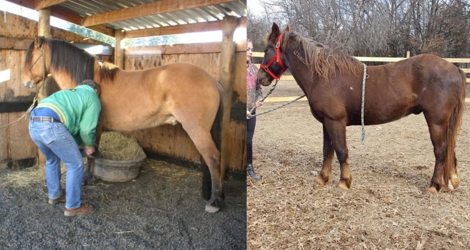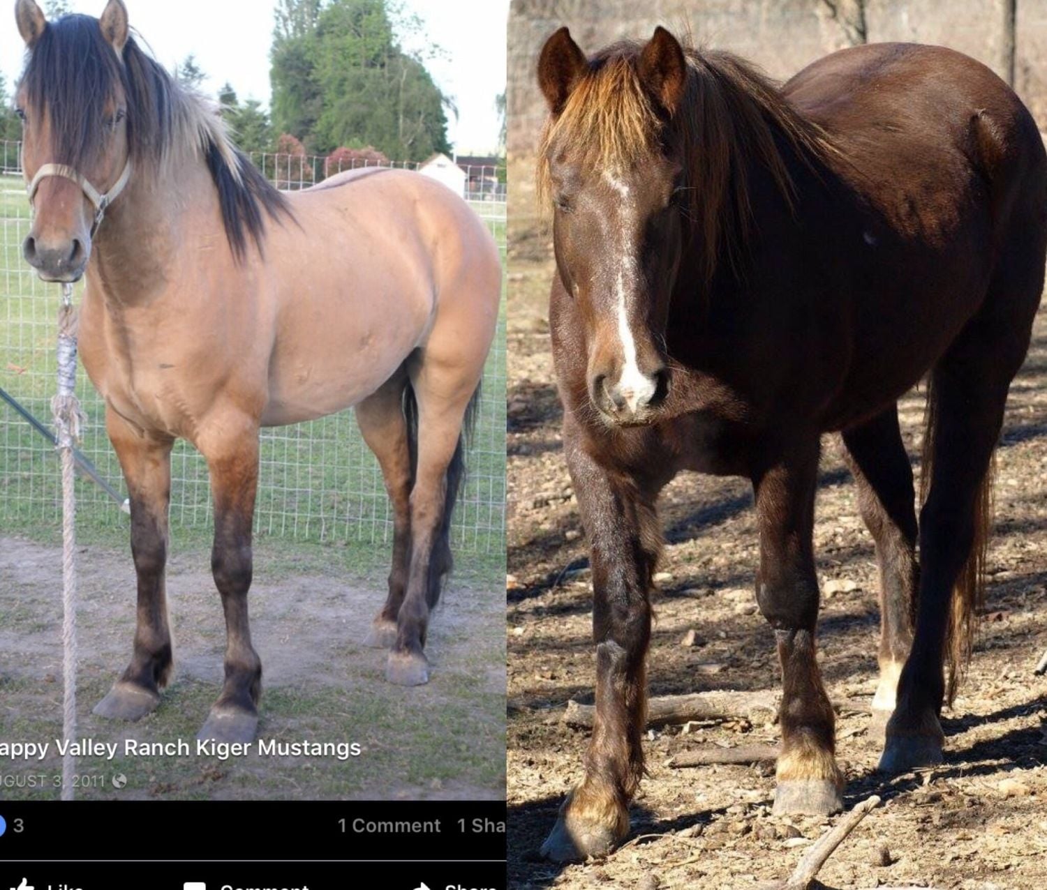 It's funny - when I compare the pictures, I see little similarity at all. The horse on the left has a narrow chest, narrow rump, shorter back, smooth muscling, cresty neck with a big jaw (even for a stud) - it has a very "Spanish" look about it (and rather than big feet, I see long feet that need a trim). The horse on the right has a broad chest, wide butt, massive muscling on relatively large bones, almost no crest on the neck at all and half again as much back (particularly in the loin) - other than them both being relatively small horses, they don't have a lot in common.I looked up a kiger mustang stallion and started comparing pictures, and I do see where she's coming from now. He has the neck/mane that comes far down, deep chest, short back, big feet, feathering, and although he's not dun, he does have a stripe down his back. I still think it's a long shot, but it's kind of fun trying to figure him out!