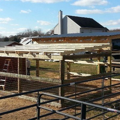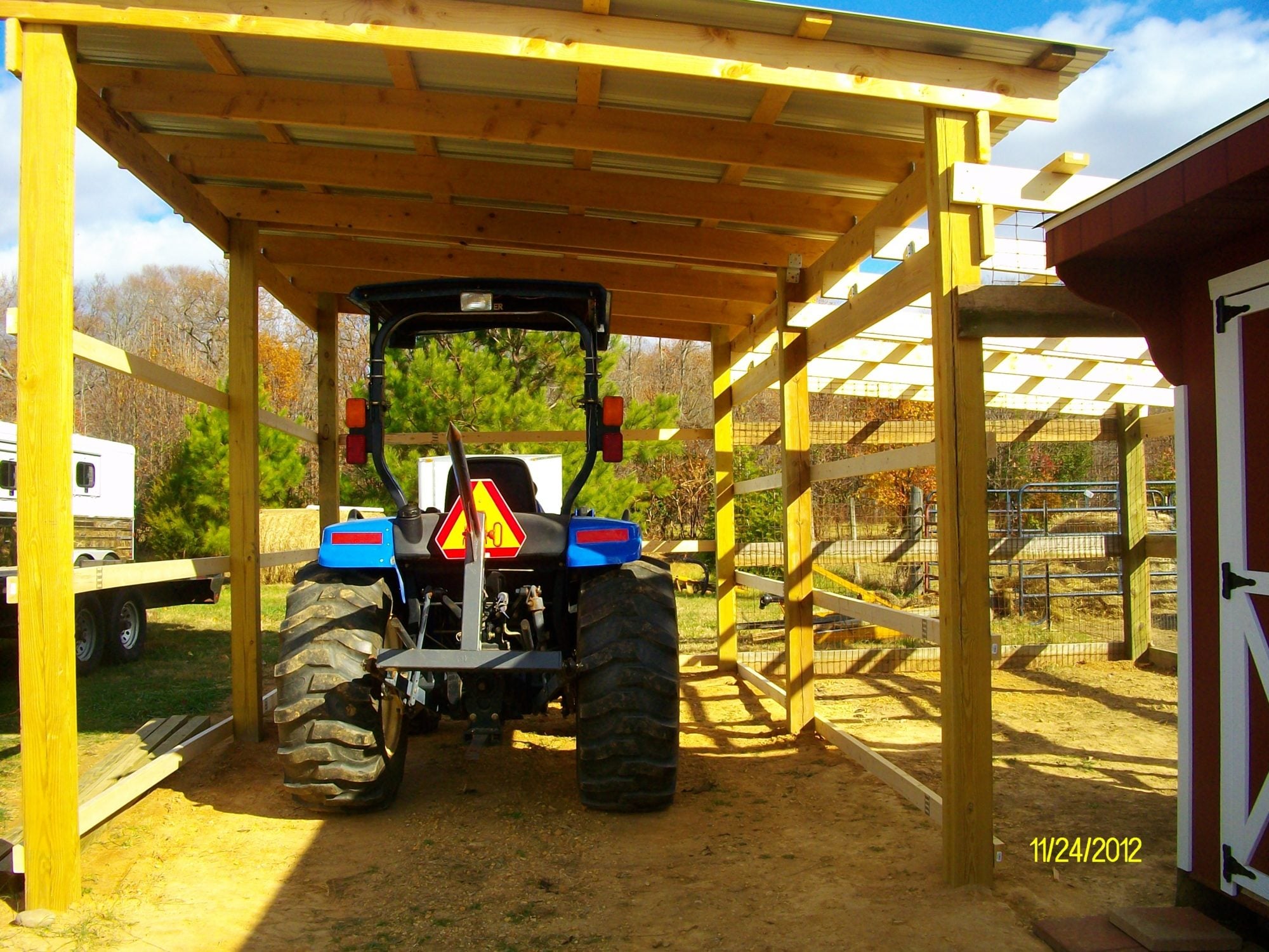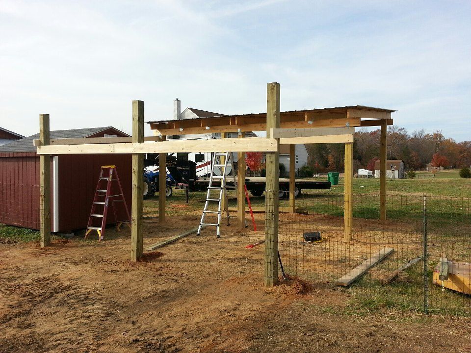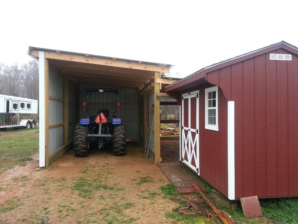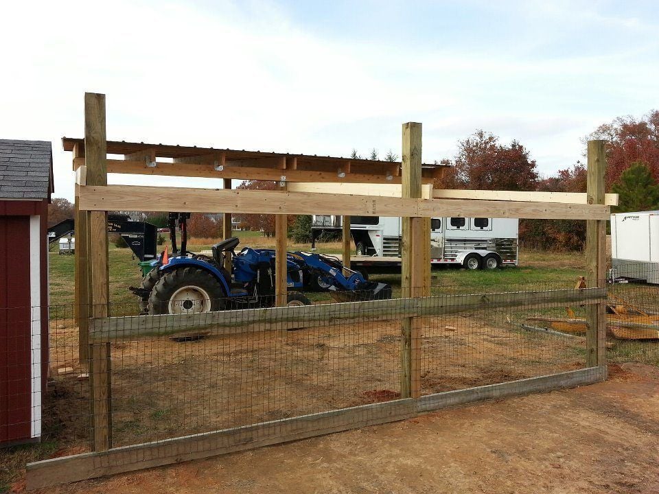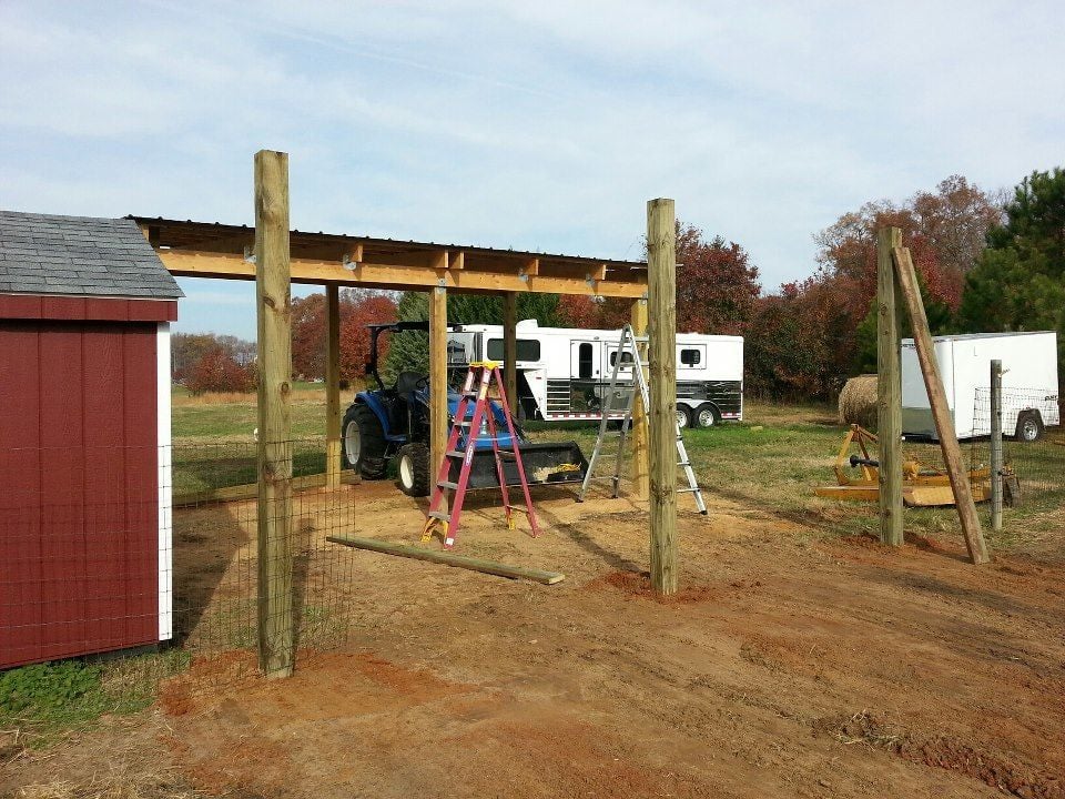 Kinda out of order, but here are some pictures of the tractor shed and chicken run that we built. You can easily use the same design to make a 3-sided 10x10 or larger run-in for horses. You'd have to line the bottom 4' with thick plywood to prevent a horse from kicking through the sheet metal. We've built several of these over the years on different properties we have owned. All are still standing and look great, one even withstood an F2 tornado.