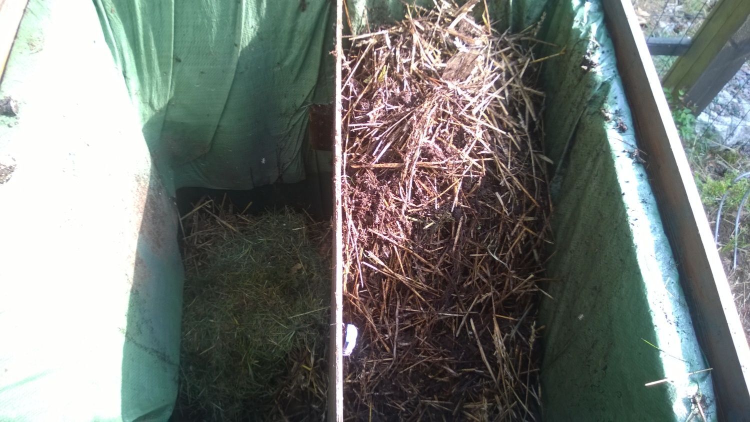 When harvesting our potato tower, I took most of the peat and soil in there as cleanly as possible and threw it in with batch 1 into the maturing cage. The straw we used to line it, the seed potatoes, all green stuff and quite a lot of the peat and soil that was too mixed with the straw ended up filling batch 2, and I got started of batch 3 too. This morning when turning batch 2, there was already a nice heat brewing in the middle of the pile. I expect it to get hot within a few days. I'm a bit worried that the carbon content of the straw is a bit too much for this, but once it starts to break down a bit, I can mix the more nitrogen heavy parts from under it together with this. Until then, it should soak up some of the ammonia being released from the bottom. Also, it makes the compost pretty fluffy, so I think we'll get a nice aerobic breakdown process going in there.