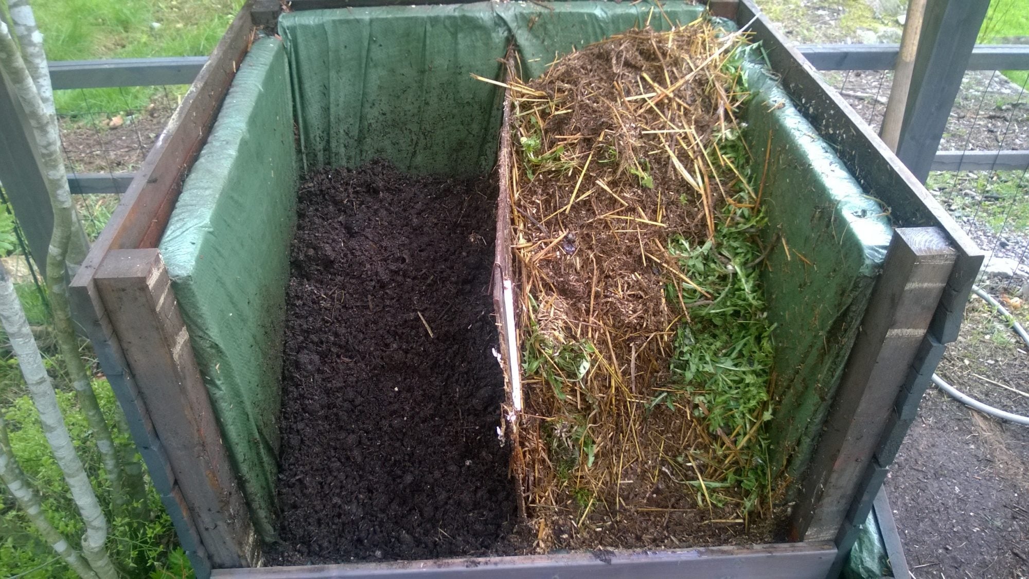 I'm still having issues with getting the lowest part to decompose properly. When I built the box, I should have put the drain pipe lower. Right now, basically everything below it stays a bit too dry, and doesn't get enough oxygen. I've been trying to push some water into the drain pipe from the outside, but I should have started that earlier, because all it has resulted in is that the bottom 4-6 inches is a horrible stinky mess. Now that I got the left part emptied, I dumped the bottom part of it on top of the right side, it will smell bad for a while, but hopefully it will break down nicely. My resting pile was looking a bit compacted too, so I tried to fluff it up a bit before I added this new batch. I once again got two wheelbarrows of beautiful compost.