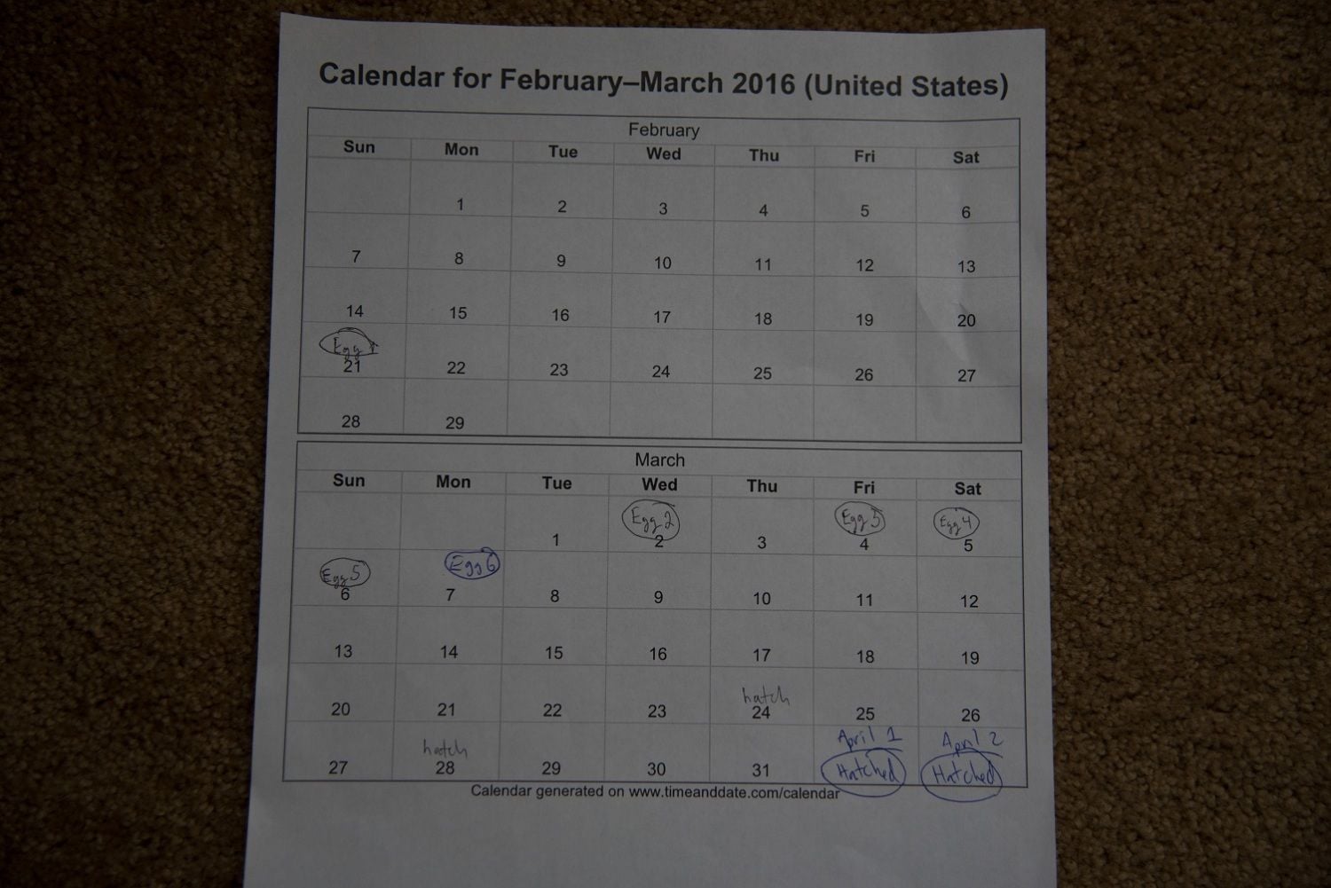 i also included a calendar. She started sitting on the eggs full time between Egg 2 and 3, which had me worried, because it was about 30 days already. Going off a 22-26 incubation day, i labeled the calendar with my estimated time for their hatch date.