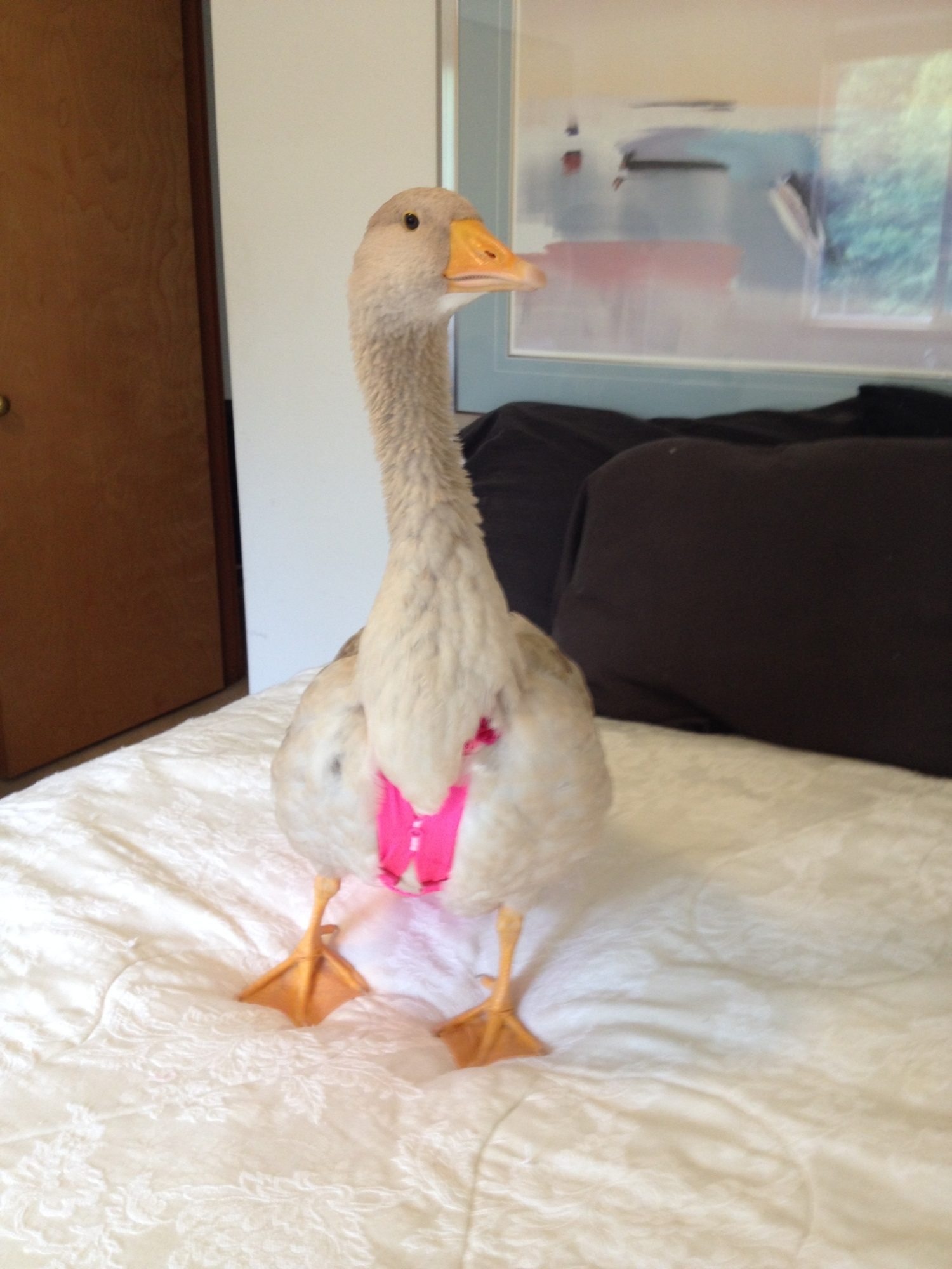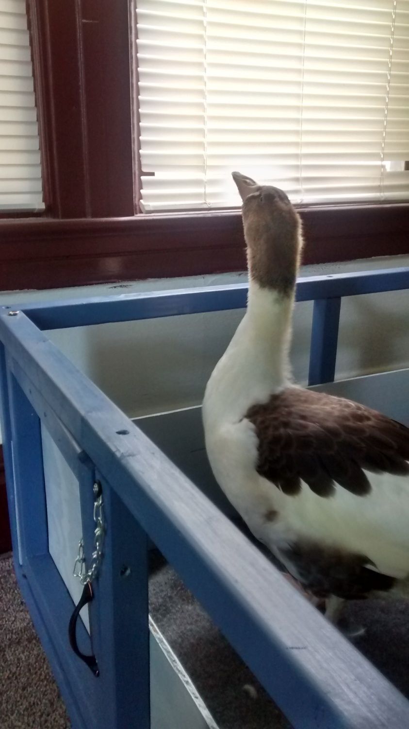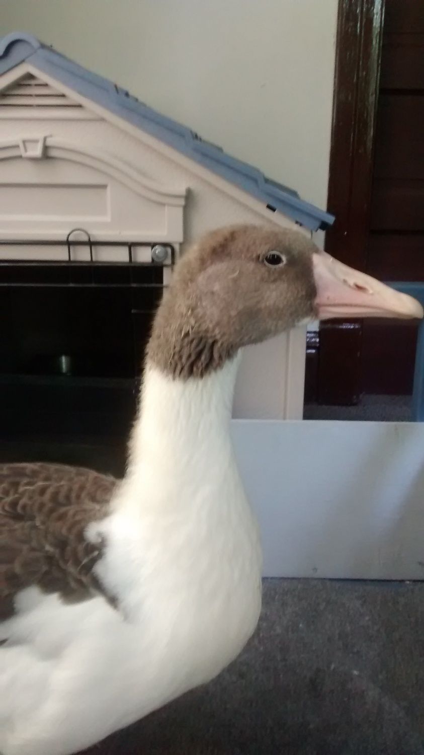 She's been like this since we got her, it's weird. The other geese are bullying her so now she's inside with us. We actually ordered some more goslings so when they come she'll go live with them because she isn't imprinted on people like Pear is