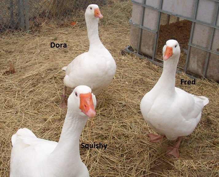 Buster the gander thinks he hates me and greets me with hisses. He was running feral in a large flock when I bought him and his lady friend. Then hiss hisses turn to little honks and softer noises and his tail wags like mad. I'll be keeping a wary eye on him as breeding season approaches. The Pekins are also not very friendly as I bought them out of a poor situation a year ago. They get excited to see me but keep their distance.