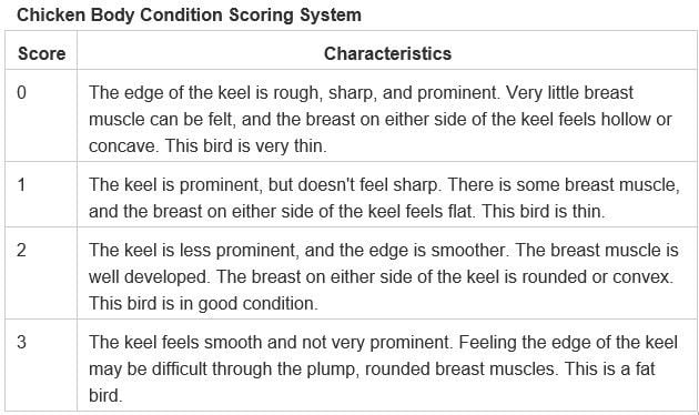 If your birds score 0 or 1 using the charts below, then there is a body condition issue.