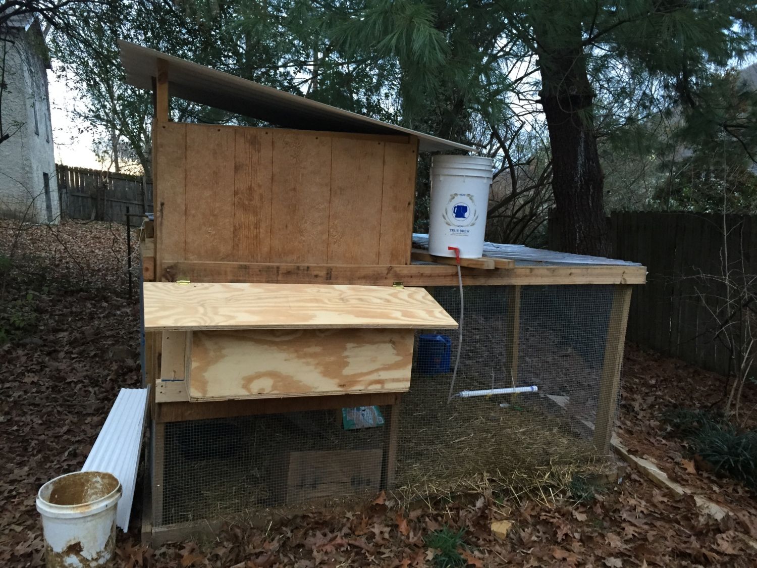 This is my current coop setup. It's not pretty, but it works for us. My waterer uses two saddle-style nipples in that segment of PVC pipe. We just moved to a new area with colder weather than our old area, and we just had our first big freeze (it was 15 degrees when I left for work) and the nipples popped right out of the pipe. I love this system otherwise - it catches the rain from the roof to fill the bucket, and the nipples reduce waste.