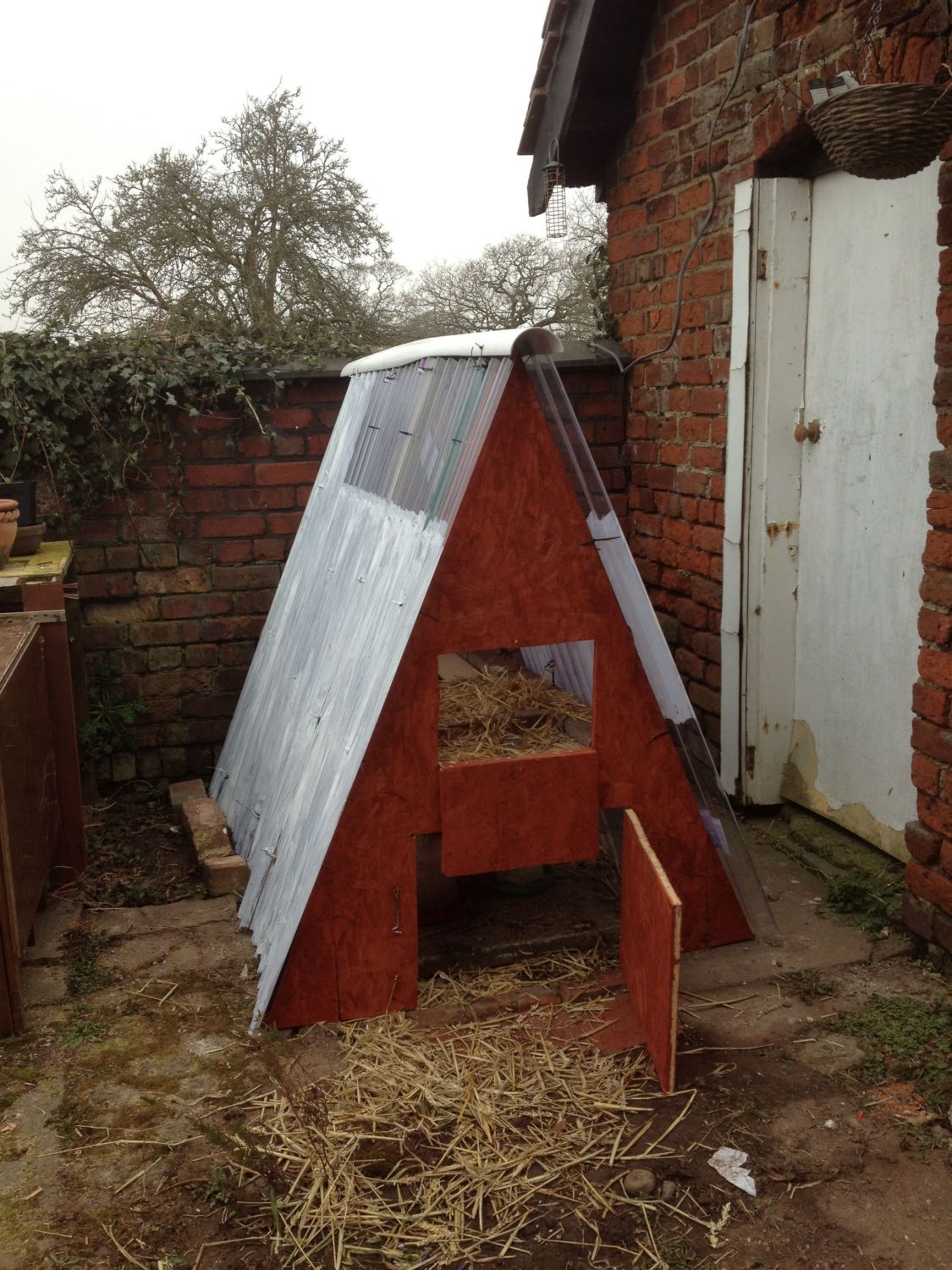 This is a home made coop I've been working on for my three ladies. It's built around an old garden swing A-frame and has a ground level (half hardstanding, half earth) and an upstairs roosting area with 2 nesting boxes against that open hatch.