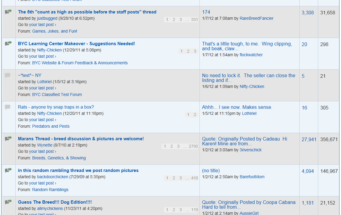 On the old system, I would scroll to the bottom of the index page and click on "my posts" or something to that effect, or I could click on "recent posts" then scroll to the bottom of that page and click on "my posts". This would bring up a page showing all the threads that I'd ever responded to in descending order, starting with the one most recently responded to.