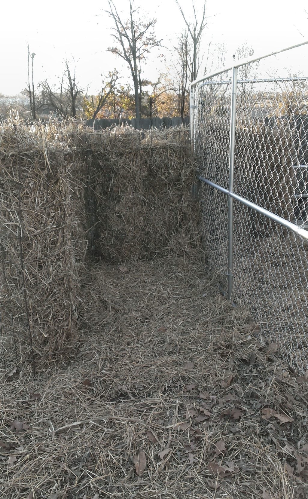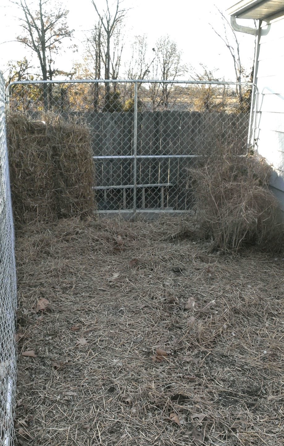 My chickens were wondering what was going on. In the background (and below) you will see the "hay towers" I made, for them to 'hide' in.