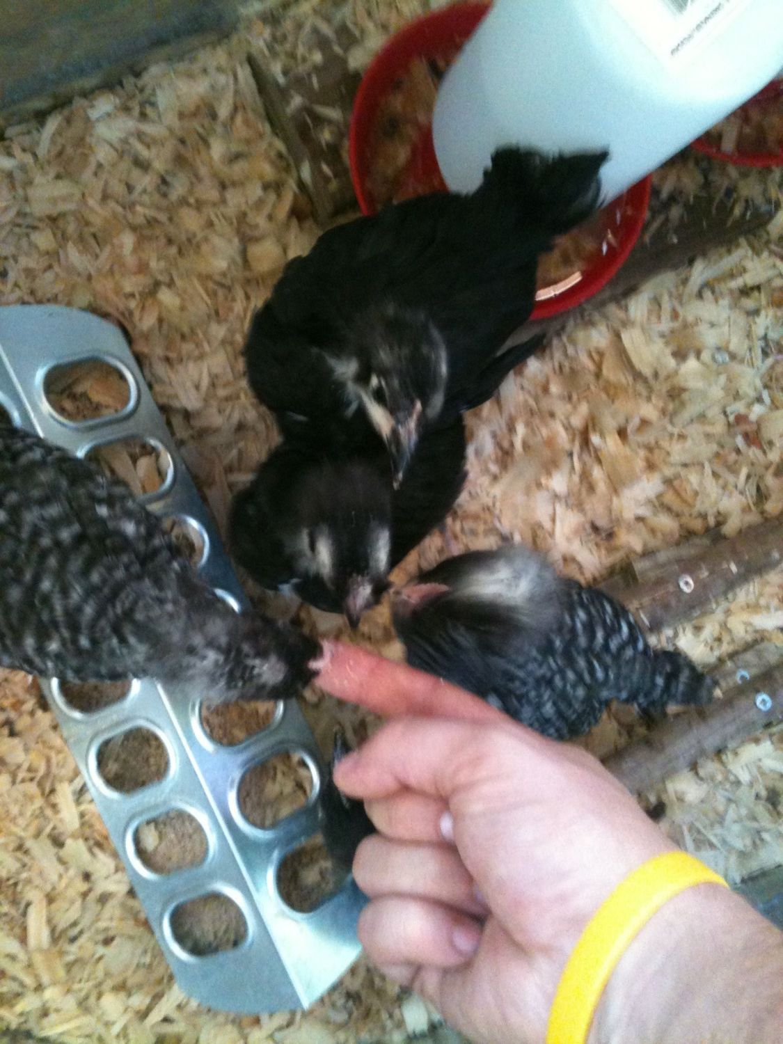 My little flock and I hit a milestone yesterday - I'd decided I was going to sit there as long as it took for them to get curious/trusting enough to come to me. I started out sitting there, with my hand in the brooder, next to the feeder and then added some feed to my hand. Most were sleeping, but my head honcho (he/she is the bravest and always the first to inspect any changes in the brooder) jumped right up into my hand, scratched around, pecked at the feed for a few minutes, and ROOSTED on my thumb knuckle! The rest woke up and cautiously made their way over to my hand, some pecking at the feed, others pecking at my hand to see my reaction...I just held perfectly still and within moments I was swarmed by 21 fuzzy-butts pecking and vying for my hand! Now, not only do they come to my voice when I go downstairs to check on them, they now don't fly to the other side of the brooder when I reach down to refill feed or change water.
