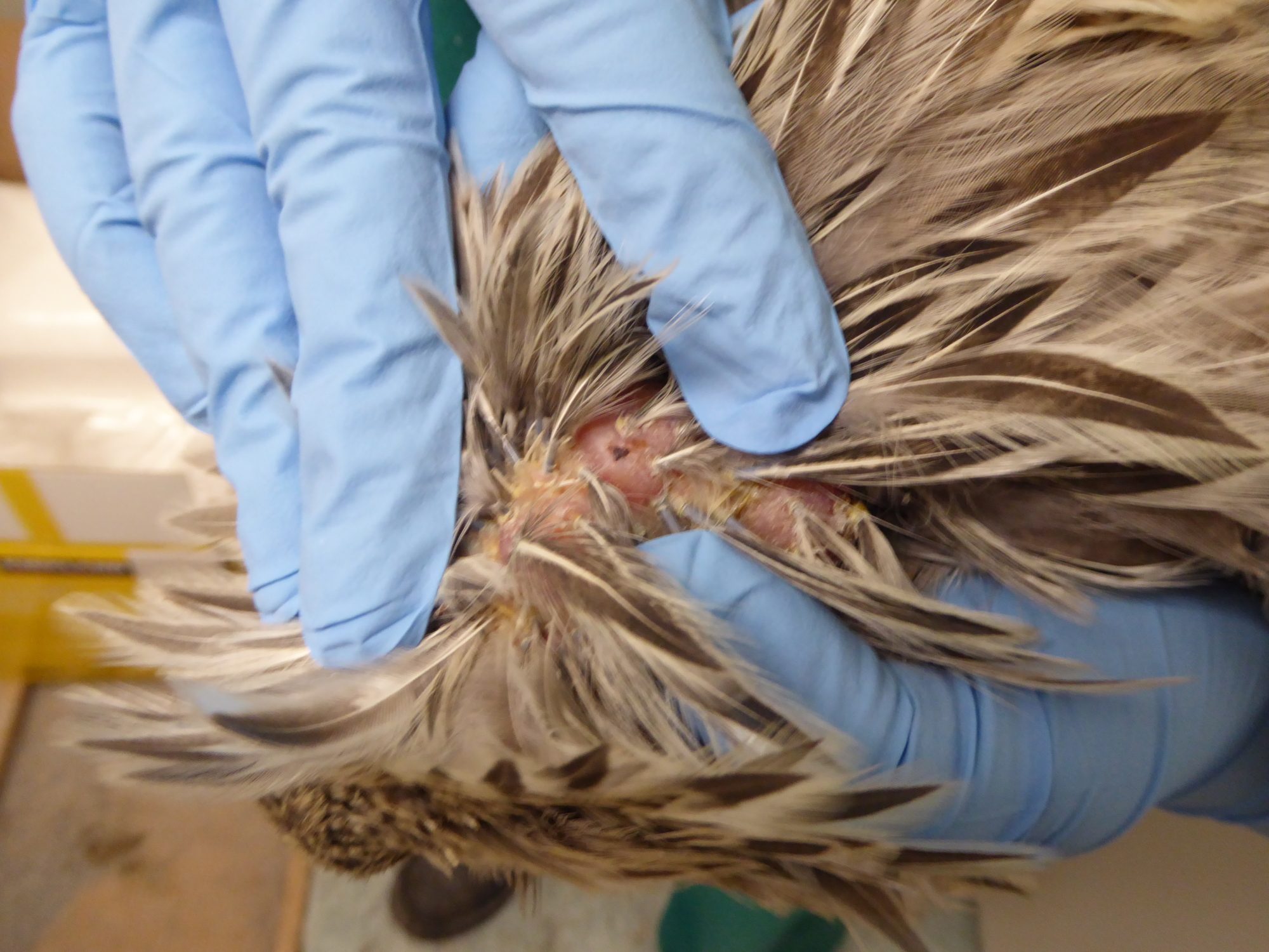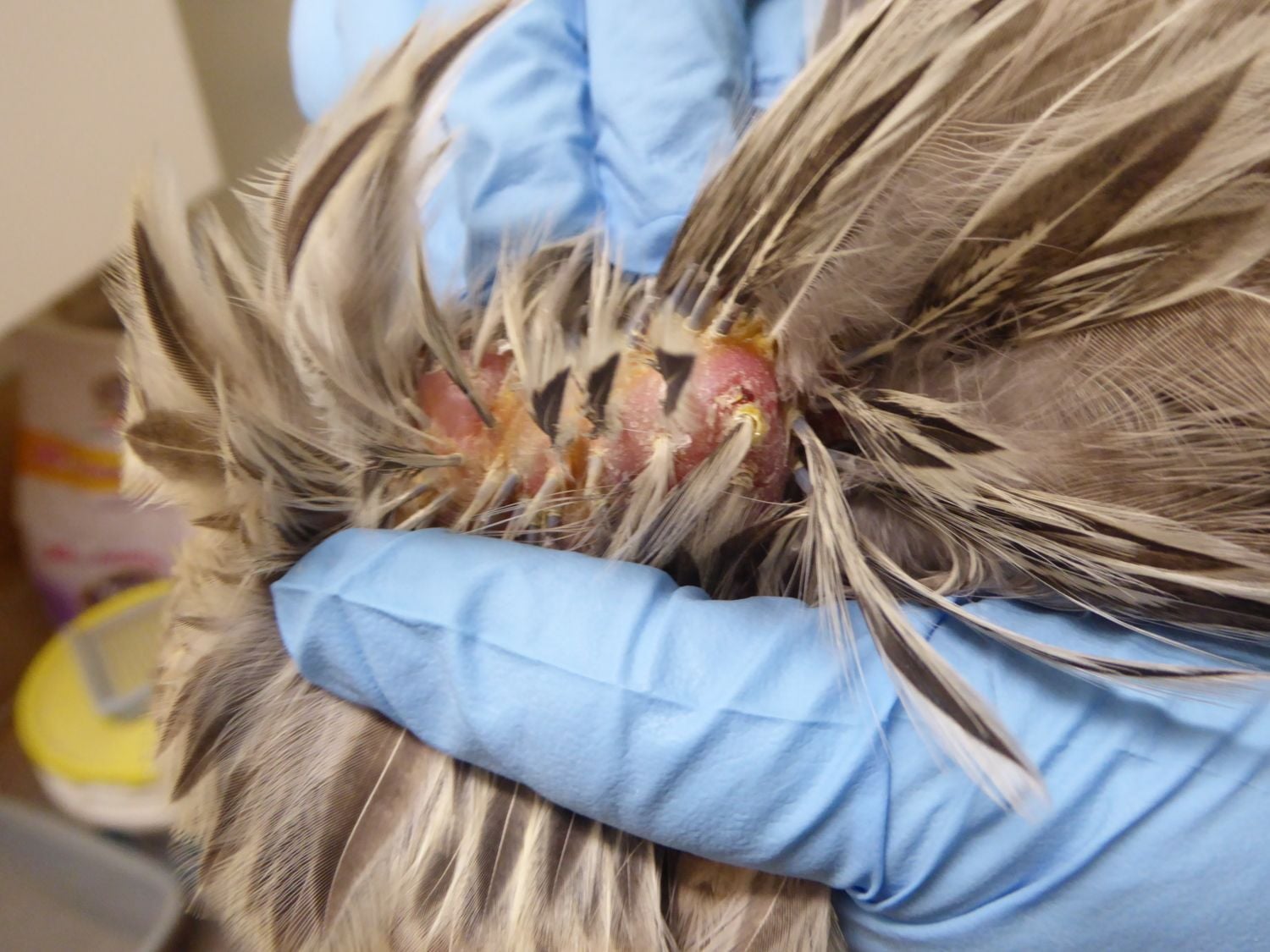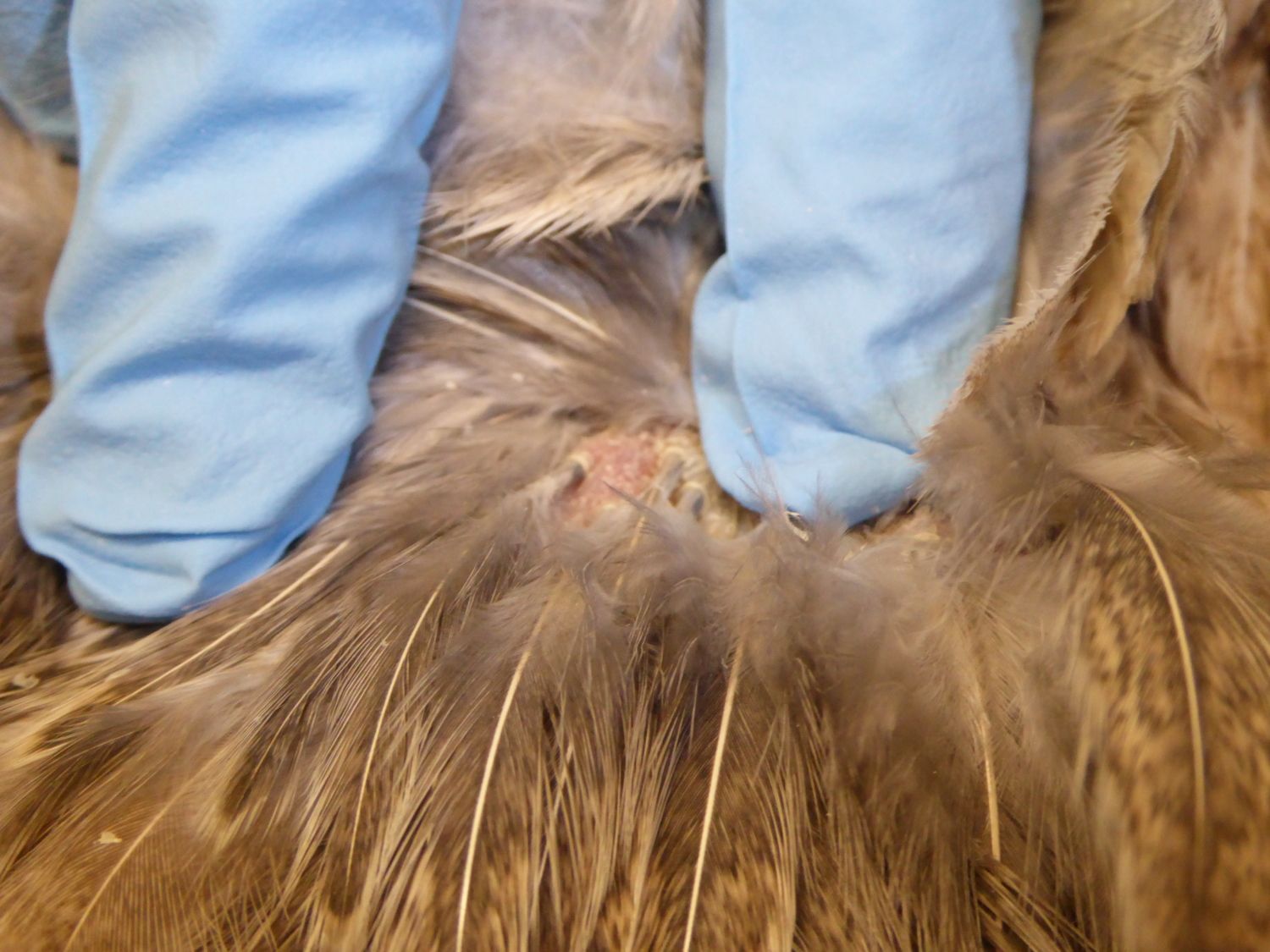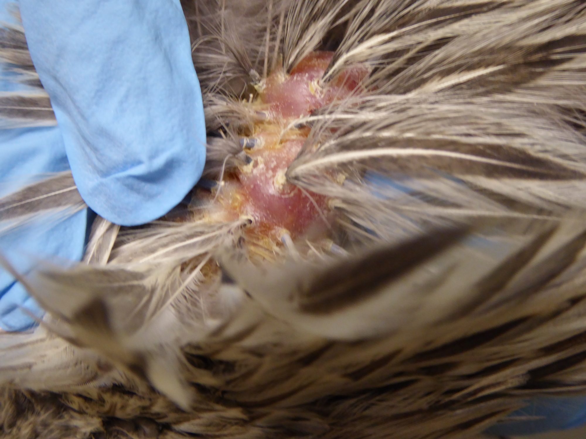 My 2 and a half year old wild type Ameraucana is covered in several feather cysts. I believe it is due to genetic nutrient deficits. I can't find any source on how to treat them other them surgery, which is not an option because of the sheer number of cysts. Also they appear to be getting bigger. The largest one is on her chest and appears to be infected, though it has scabbed over. Is there any way to treat them and what would be the best antibiotic to use for the infection? I also have taken a lot of pictures if that would help.
