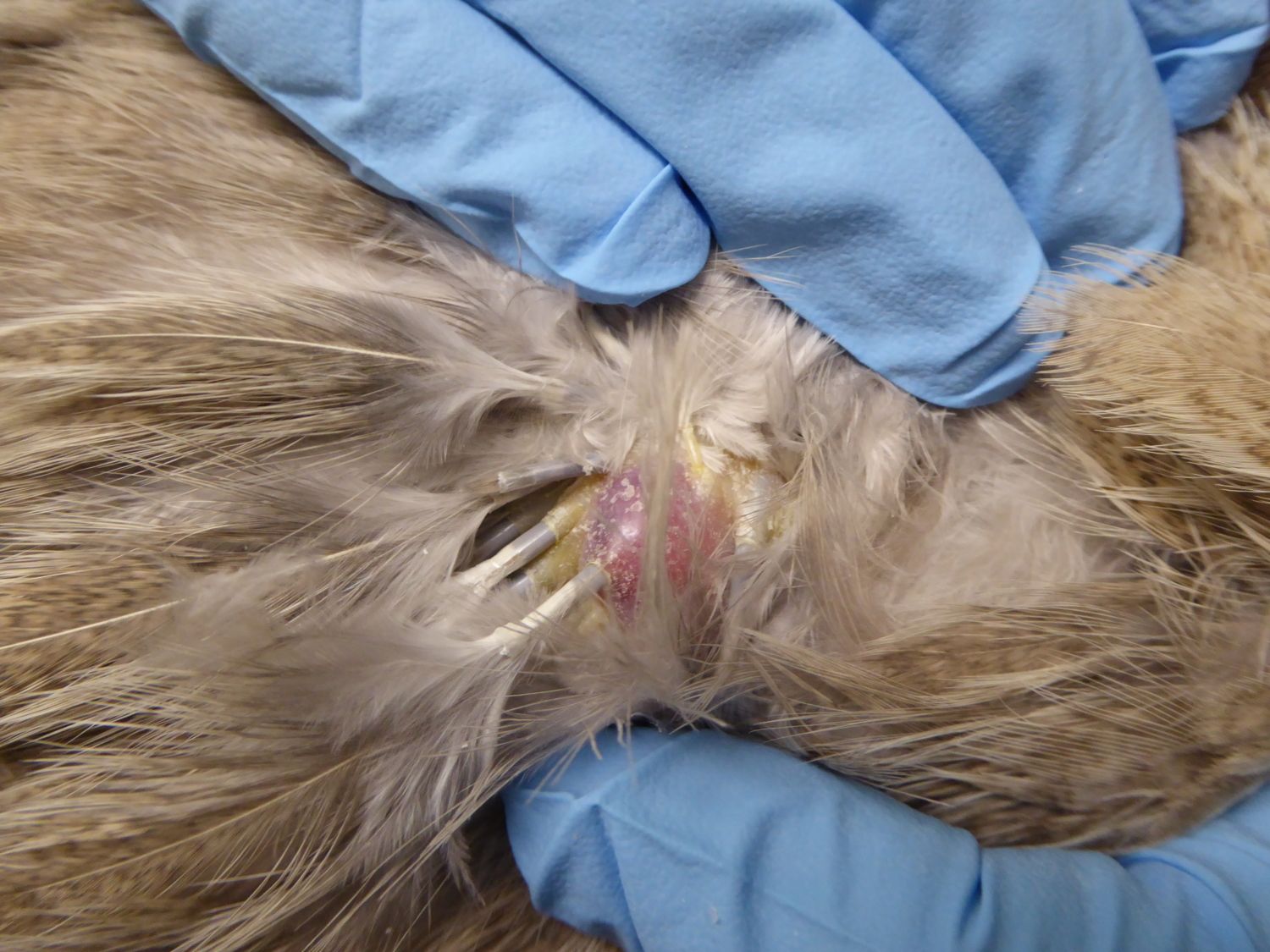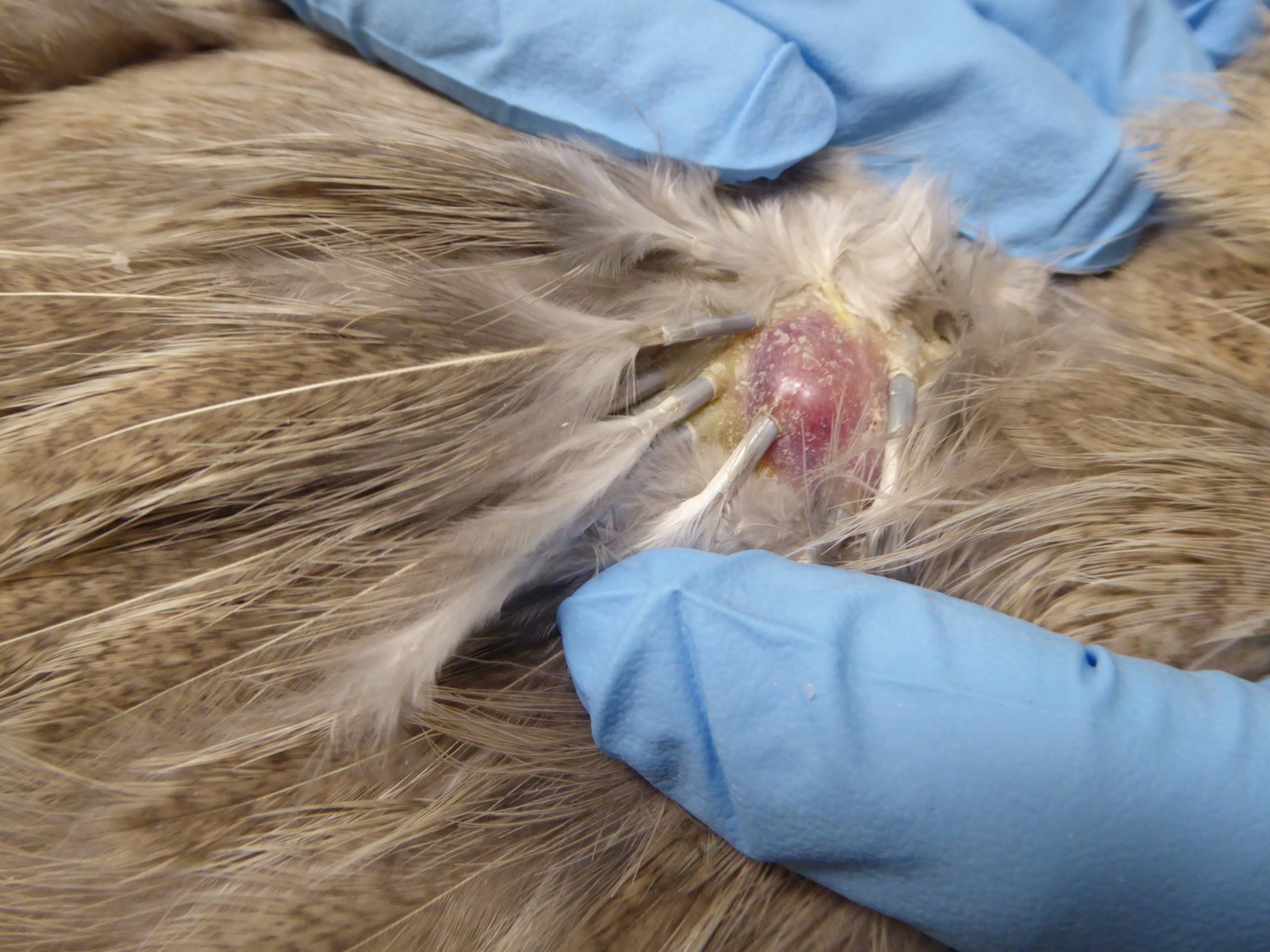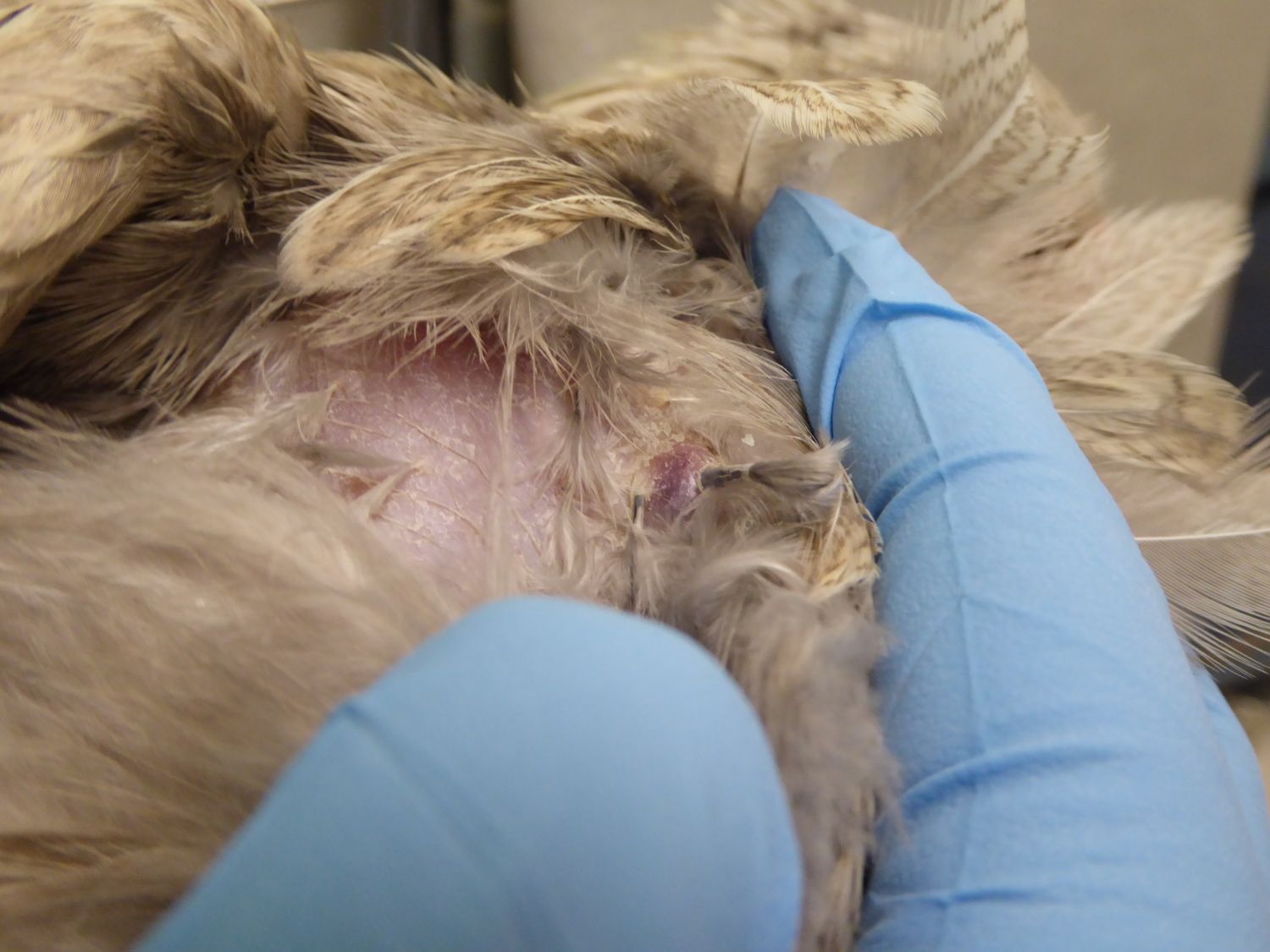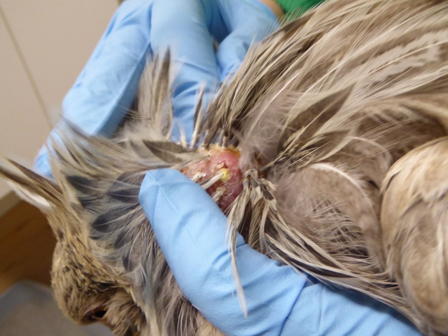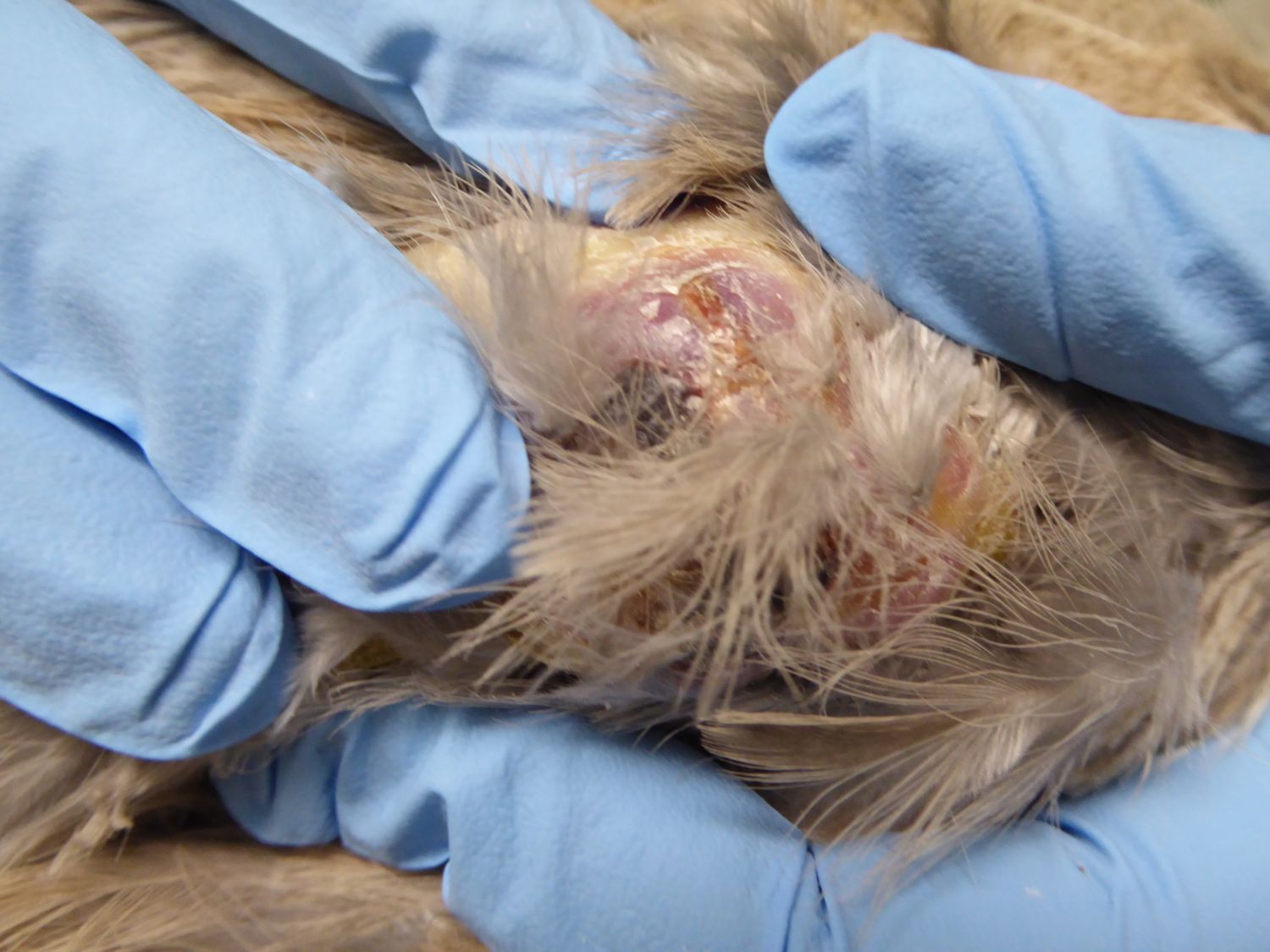 My 2 and a half year old wild type Ameraucana is covered in several feather cysts. I believe it is due to genetic nutrient deficits. I can't find any source on how to treat them other them surgery, which is not an option because of the sheer number of cysts. Also they appear to be getting bigger. The largest one is on her chest and appears to be infected, though it has scabbed over. Is there any way to treat them and what would be the best antibiotic to use for the infection? I also have taken a lot of pictures if that would help.