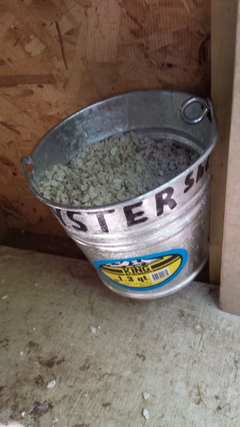 I put my oyster shell & my grit in a pvc pipe feeder. Doesn't take up any room, easy to fill and easy for the chickens to get to it. I attache them to the hardware cloth with bungee cords. Loves those things!