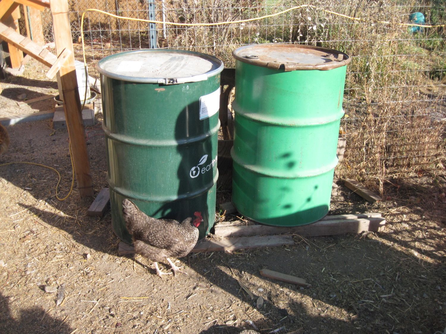 I also have a big oil drum that was left by the previous owner. I can keep 250 pounds of feed in that in my grain room, and it currently has layer pellets in it.