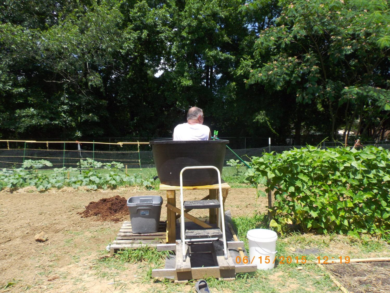 We capture water from the house roof and shed roof when it rains, so there are 3 150 gallon tubs to use. I left the closest one dribbling from a hose just inside the run after 5PM and it was a hit! There is just enough of a grade so it won't puddle, and the tomatoes on the other side of the fence are also enjoying a drink!