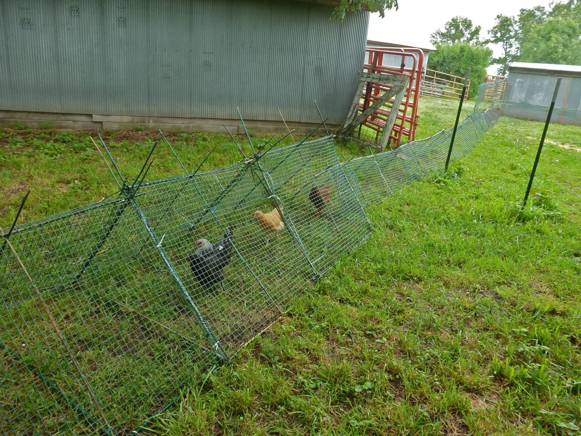 Over the past week I built about 50' of chicken tunnels. I am a 64 yr. old woman, so if I can do it anyone can. I had planned to let my 4 hens, (now 10 wks old,) free range, but began thinking twice about that idea. The tunnels are in sections, movable, and there are 3 taller, wider sections at the end making a 10' X 4' room. The sections are made with bamboo poles, (holes drilled at ends,) tied together in triangles with cable ties, covered with plastic mesh, and secured to the ground with tent stakes. The chickens must step over the cross pieces but this doesn't seem to slow them down. It is fairly easy to move the whole system to fresh areas that need 'work'. The day I first opened the tunnel, the chickens were in the corner of their pen watching me fasten it together. Right away they had figured out that 1. it was for them, and 2. this is where it would connect. Each day I added more sections as I built them. They love it. It's fun to see them all running down the entire length. They are locked in their shed at night and only allowed in the tunnel during the day. I realize that the tunnels are not truly predator proof, but it is less vulnerable, and so far, so good. If I decide on free range in the future, these sections will then be used to cover plants in the garden to protect them from the chickens.