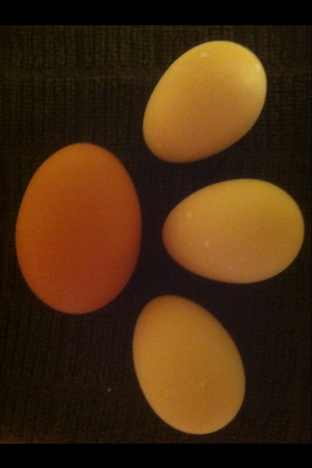 Three of Gertie's eggs next to a large size from the golden sexlinks.