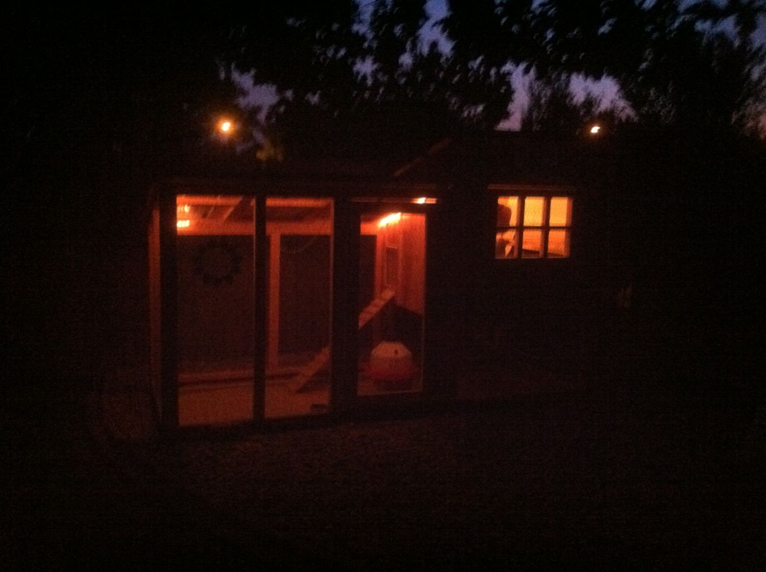 Hi Bruce,You should NOT light at night. If they aren't up on the roosts when the light suddenly goes out, they can't see well enough to get there. Light only in the morning. Figure out what time the sun will set and calculate back from there to get the number of hours desired. Adjust every few weeks.