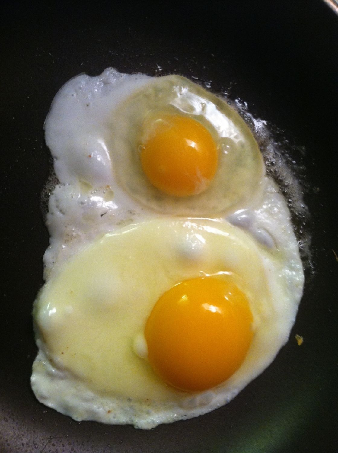 We light at night and have never had a problem with "lost hens in the dark" not finding the roosts. We have had issues though with all the extra light in the wee early hours, so decided 6am-8pm works for our flock. Our girls usually are just finishing up their chicken crack(1cup every evening to fill their crops in winter) around 6:45pm meander their way to the cozy lights in the coop, and climb up and preen themselves before lights out at 8pm. There is no messing with timers every few weeks just set them once (mine even has a DLS setting) and your done. I think what really makes a difference with our girls, is a regular schedule. This goes for any of our animals and humans for that matter LOL! Good feed, lots of fresh water, and a regular schedule of management, keeps everyone happy and lowers stress in our household. I was just admiring today how great our chooks look! It was a brutally hot summer this year, and now they are shiny, content, and their combs and wattles are bright fire engine red! Love it! We are getting 6-7 beautiful brown eggs a day from our 7 pullets. I even cracked the Halloween Monster Egg for breakfast this morning expecting a double yolker for sure but to my surprise it was just one giant egg with one giant yolk! Here it is in the pan next to an extra large size egg........