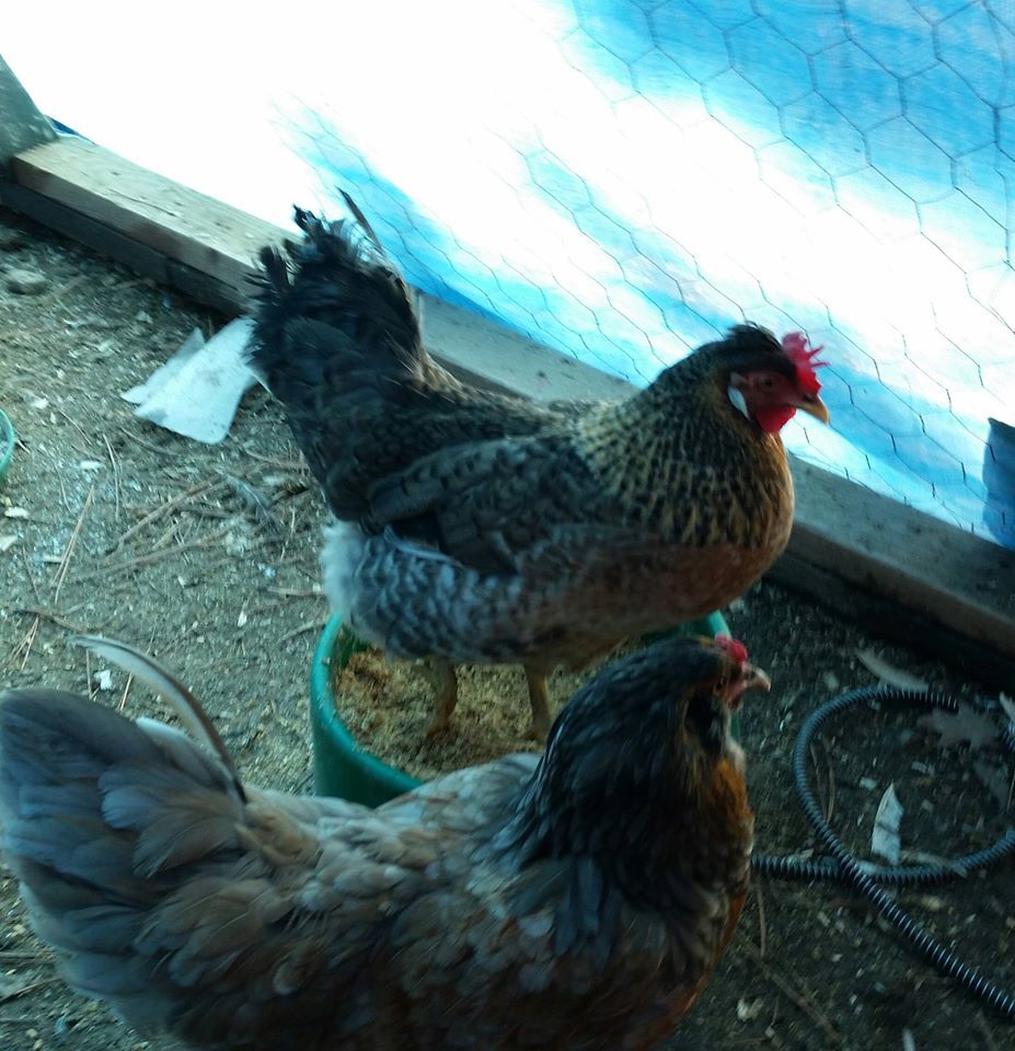 Here she is with her pretty egg, I am a proud mama. She is the one in the back, the easter egger in the front is photo bombing. I love this CLB's tail feathers, this picture doesn't show how pretty it is, her tails feathers are curled: