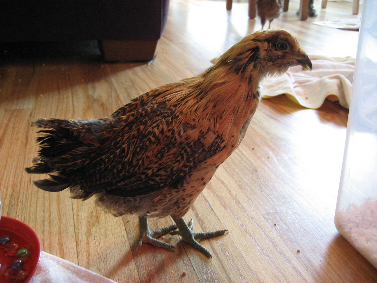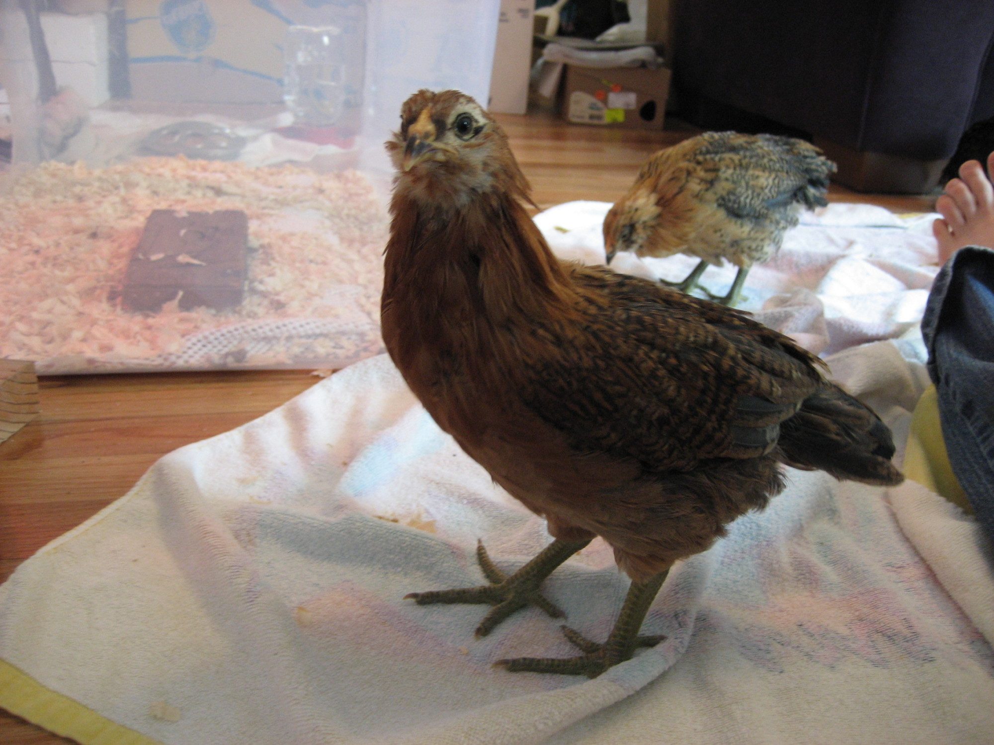 This baby had delayed feathering, which makes me suspect boy. Is that always a sign of a male? From what I was reading online, in heavier breeds it sounds like it might be sex linked. You can see this below, #3 is on the top. This chick has always been smaller than its sibling.